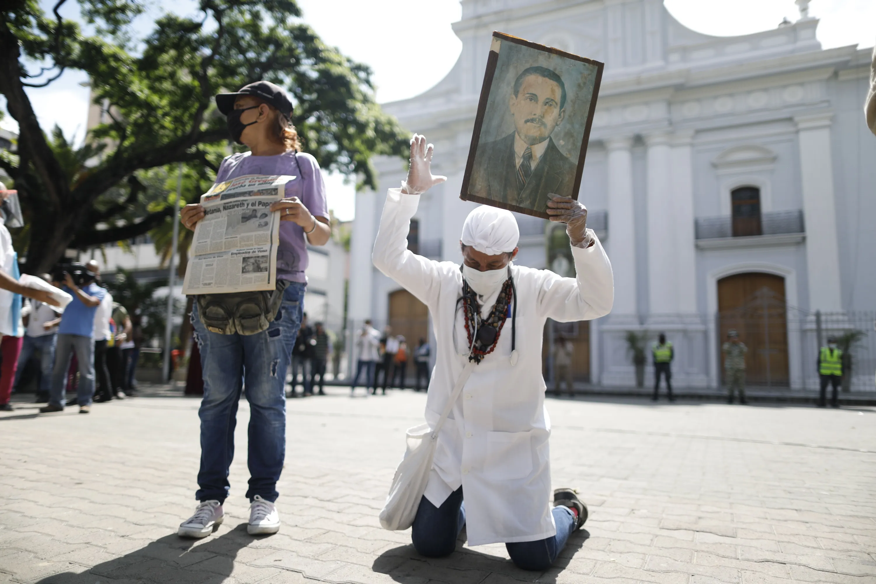 Yeni Vasquez raises a portrait of the late, Venezuelan Dr. Jose Gregorio Hernandez outside the church in La Candelaria after the church bell rang, signaling the start of his Beatification ceremony in Caracas, Venezuela, Friday, April 30, 2021. Known as the “doctor of the poor”, Hernandez is being Beatified by the Catholic church, a step towards sainthood. (Photo by Ariana Cubillos/AP Photo)