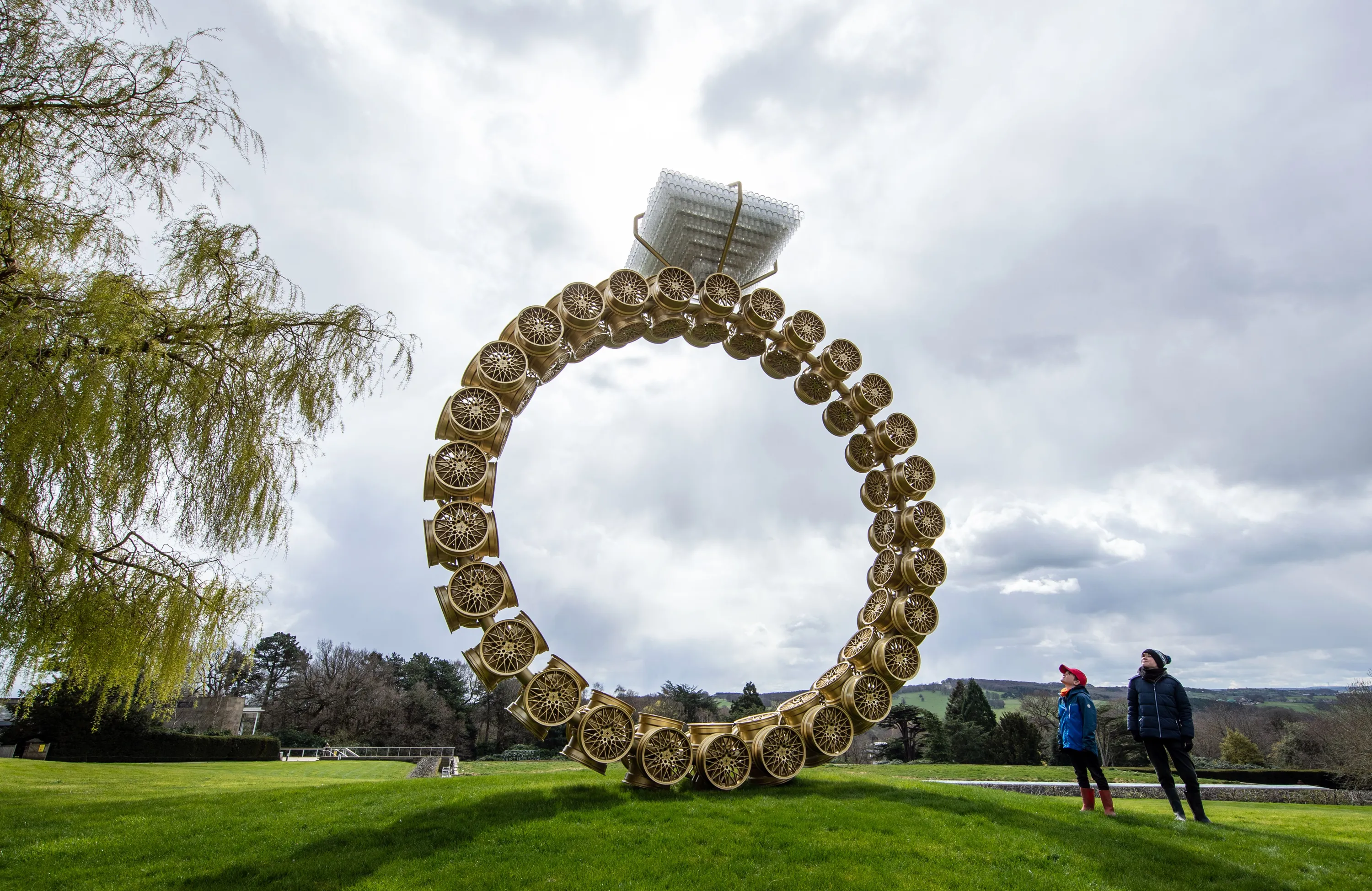 Visitors Max Blyth (left) and Finton Blyth view a work titled “Solitaire” by artist Joana Vasconcelos at the Yorkshire Sculpture Park (YSP) on Tuesday, April 6, 2021. The grounds of the park are open and the YSP is looking forward to welcoming visitors back to other areas as soon as government restrictions allow. (Photo by Danny Lawson/PA Images via Getty Images)