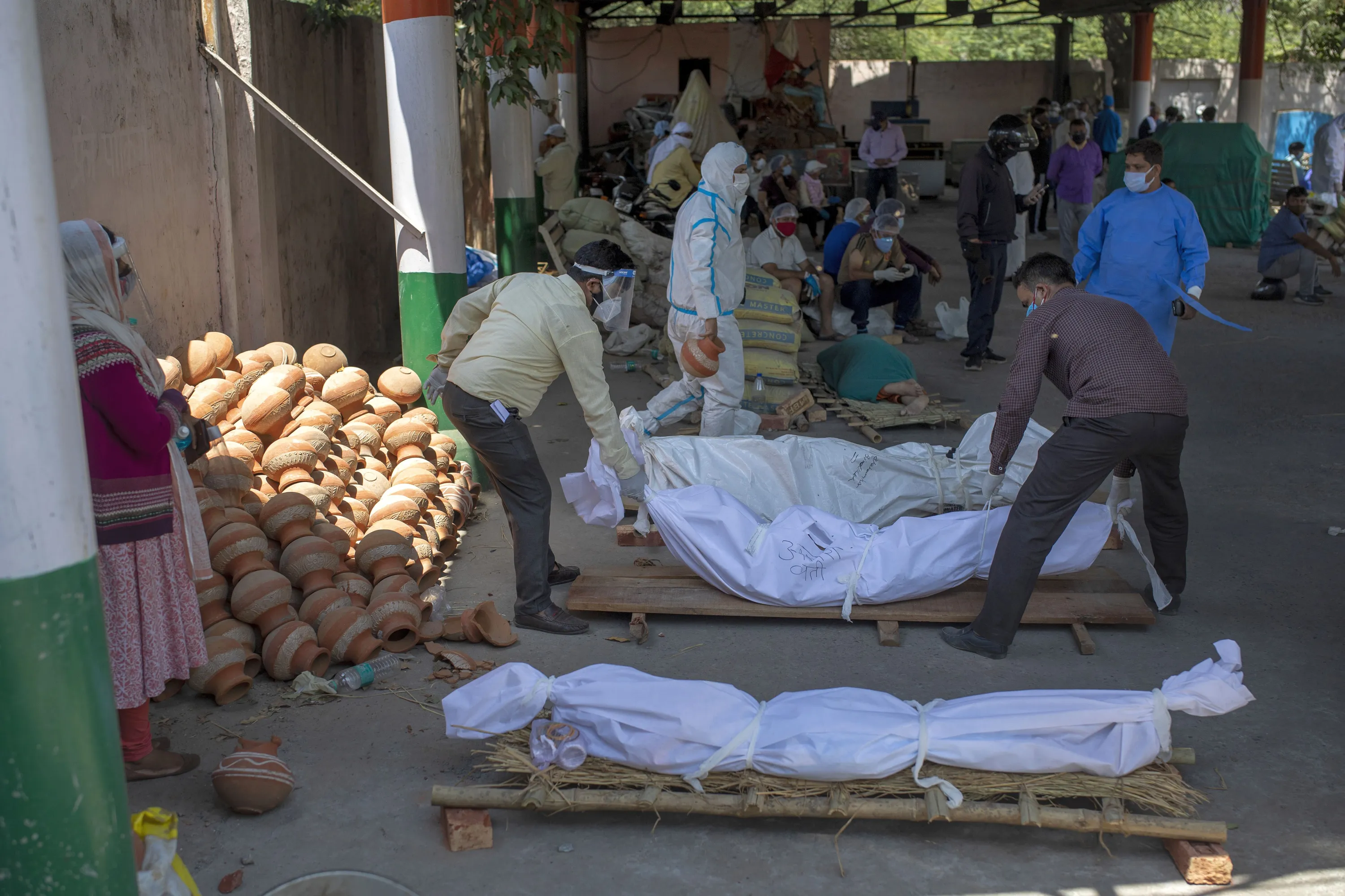 People line up dead bodies of those who died of COVID-19 at a crematorium, in New Delhi, India, Saturday, April 24, 2021. (Photo by Altaf Qadri/AP Photo)
