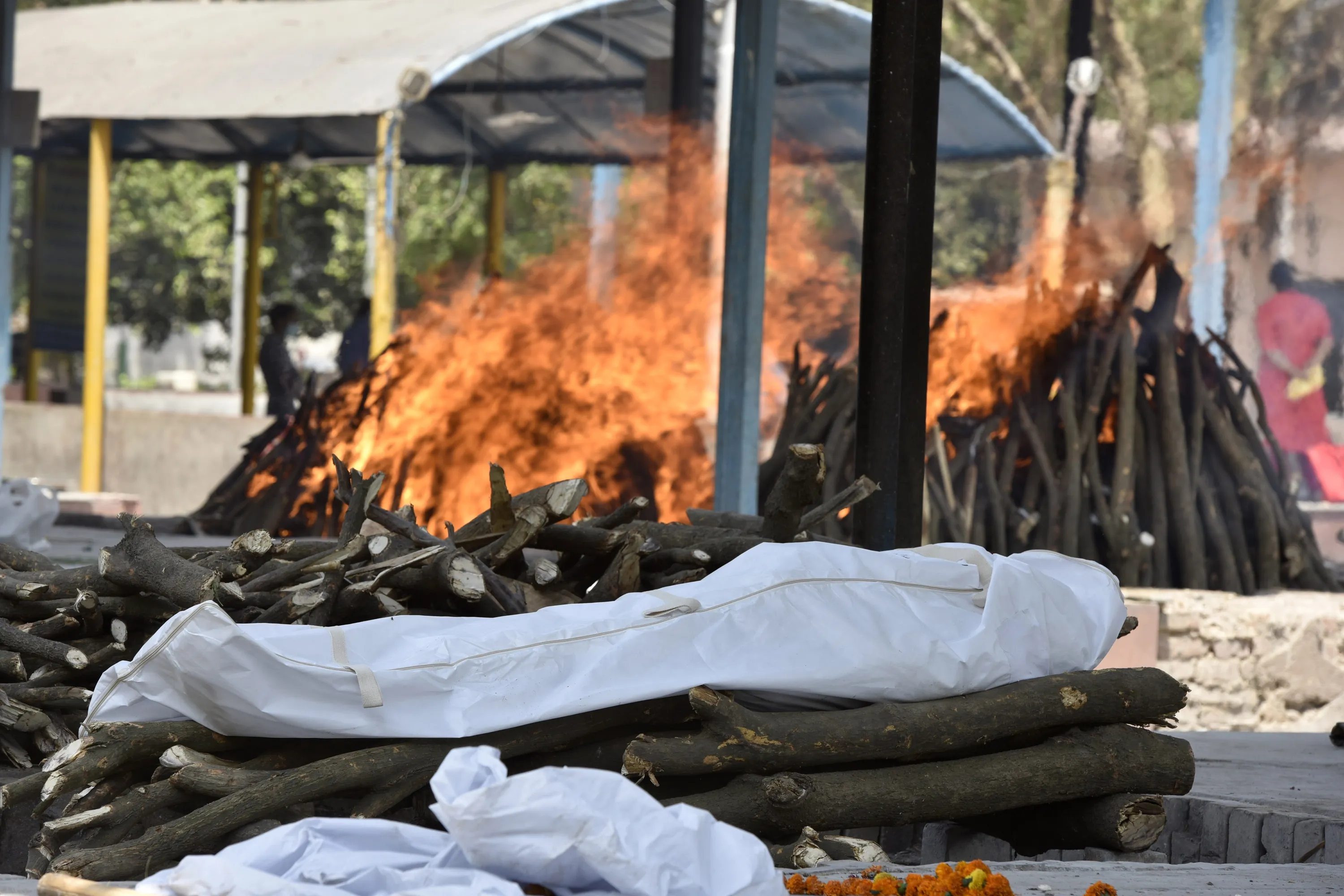 The body of a person who died of Covid-19 is placed on a pyre while others burn in the background at Sector 94, on April 21, 2021 in Noida, India. (Photo by Sunil Ghosh/Hindustan Times via Getty Images)