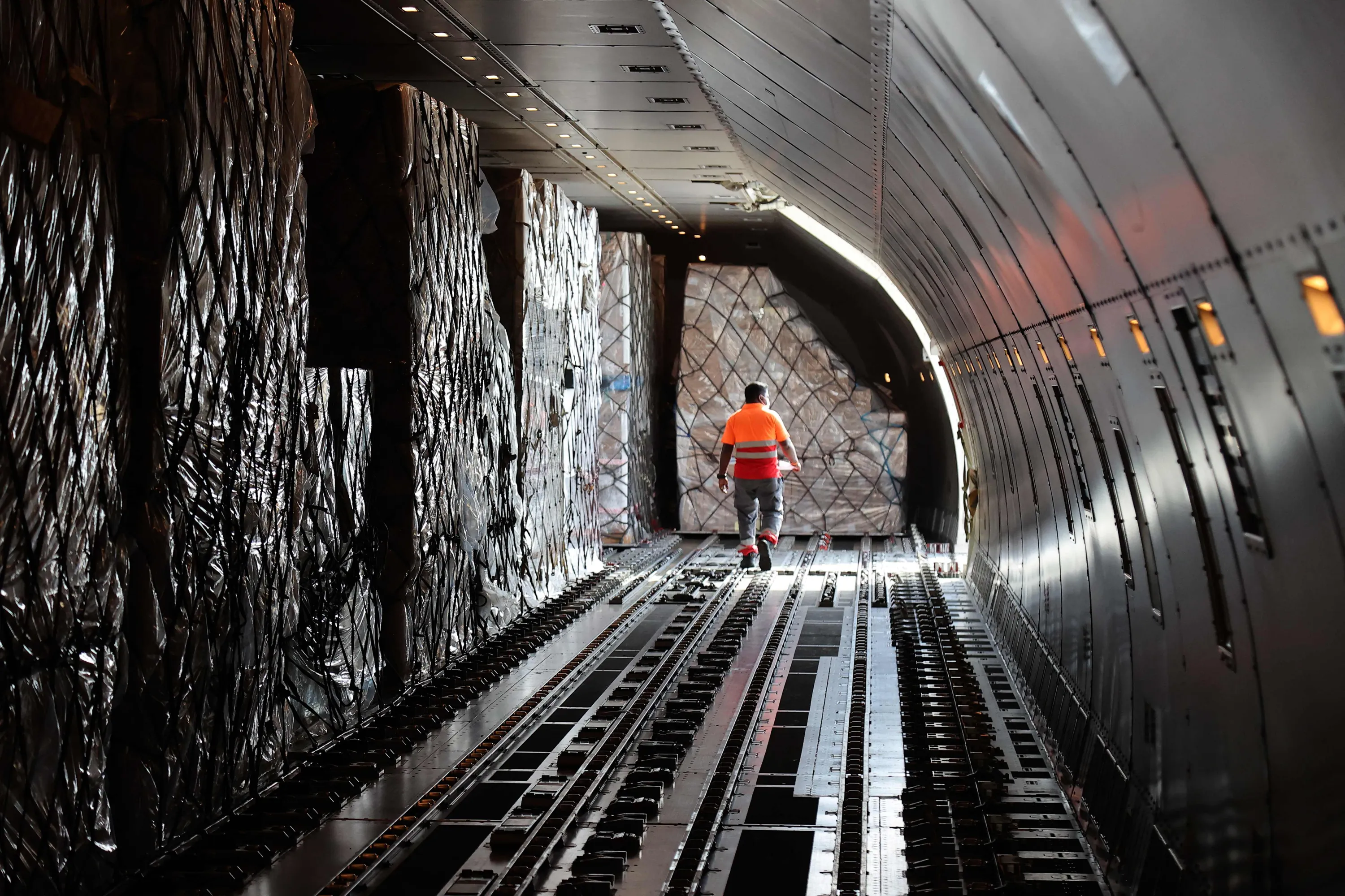Workers load 300 tonnes of medical aid to be flown in a three-flight cargo aircraft convoy directly to destinations in India, at Qatar's Hamad International Airport in the capital Doha on May 3, 2021. India's total COVID-19 caseload neared 20 million as oxygen shortages in hospitals exacerbated a devastating second wave, and much-needed foreign assistance continued to pour in. (Photo by Karim Jaafar/AFP Photo)