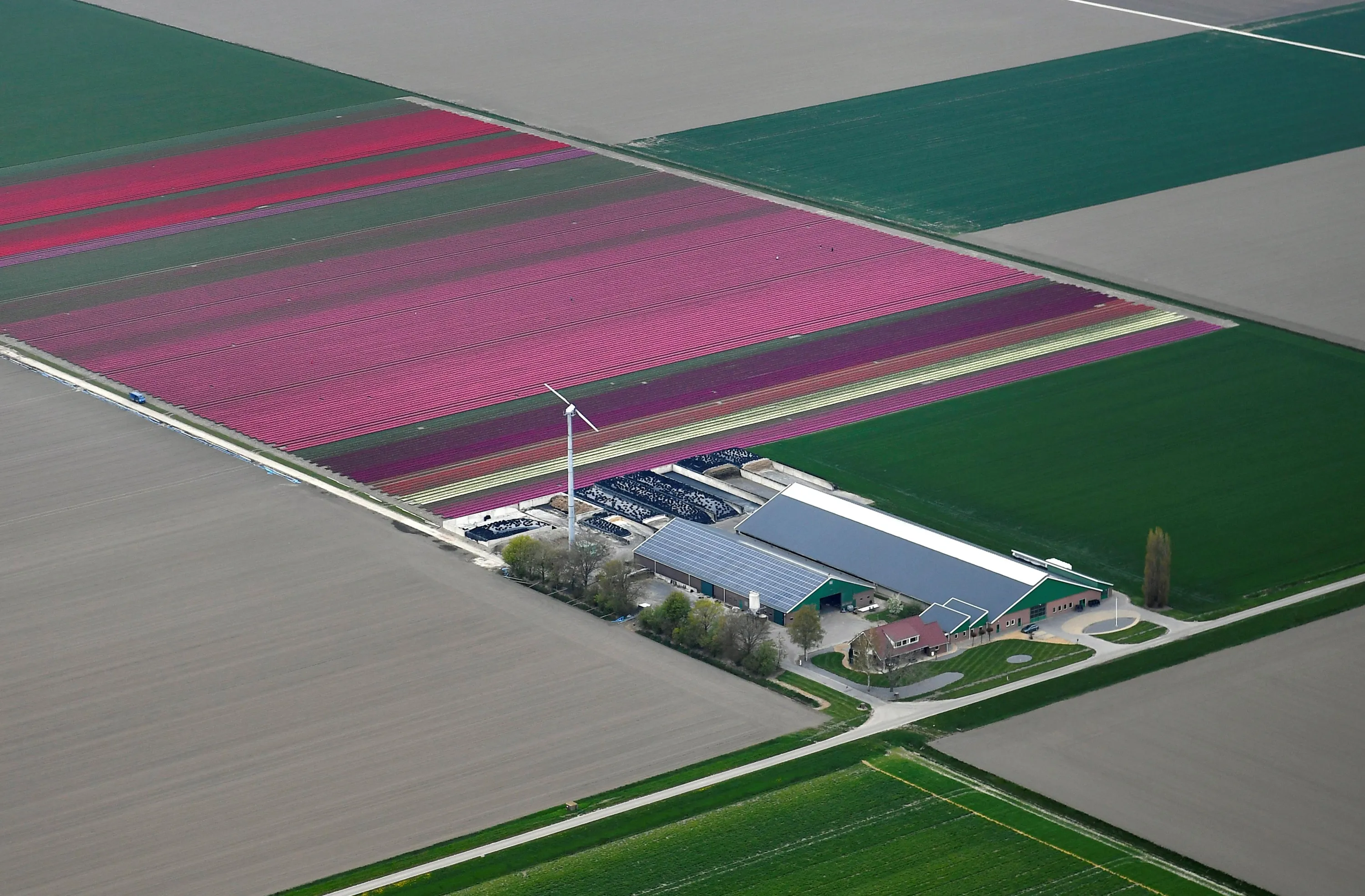 An aerial view of flower fields in Lisse, Netherlands on April 28, 2021. (Photo by Piroschka van de Wouw/Reuters)