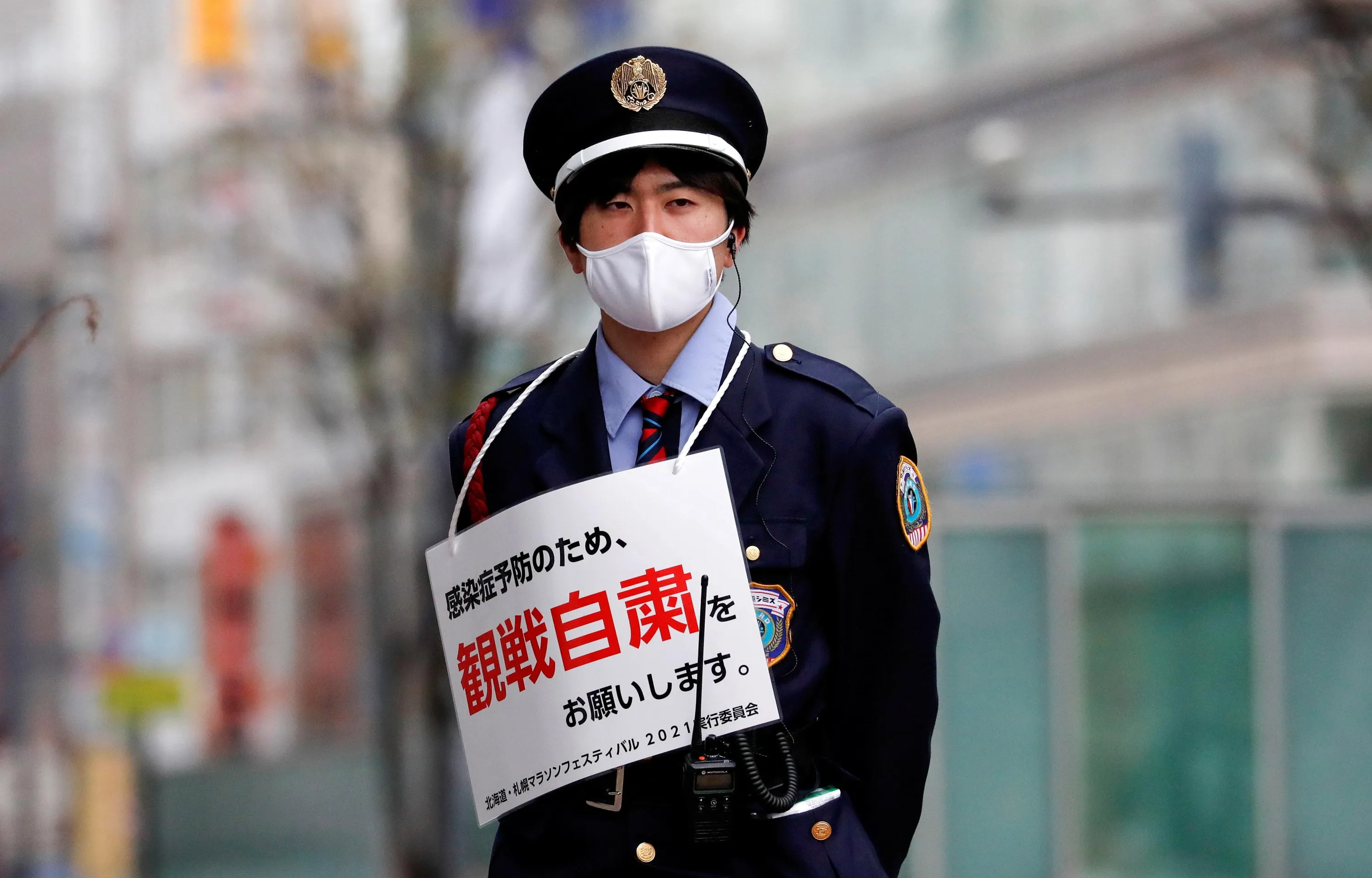 A member of the security personnel wears a sign that reads “In order to prevent infection, please refrain from watching”, along the route before the start of the Hokkaido-Sapporo Marathon Festival 2021, a half-marathon and a 10K race which is a test event for the Tokyo 2020 Olympics marathon race, amid the coronavirus disease (COVID-19) outbreak, in Sapporo, Hokkaido, Japan on May 5, 2021. (Photo by Issei Kato/Reuters)