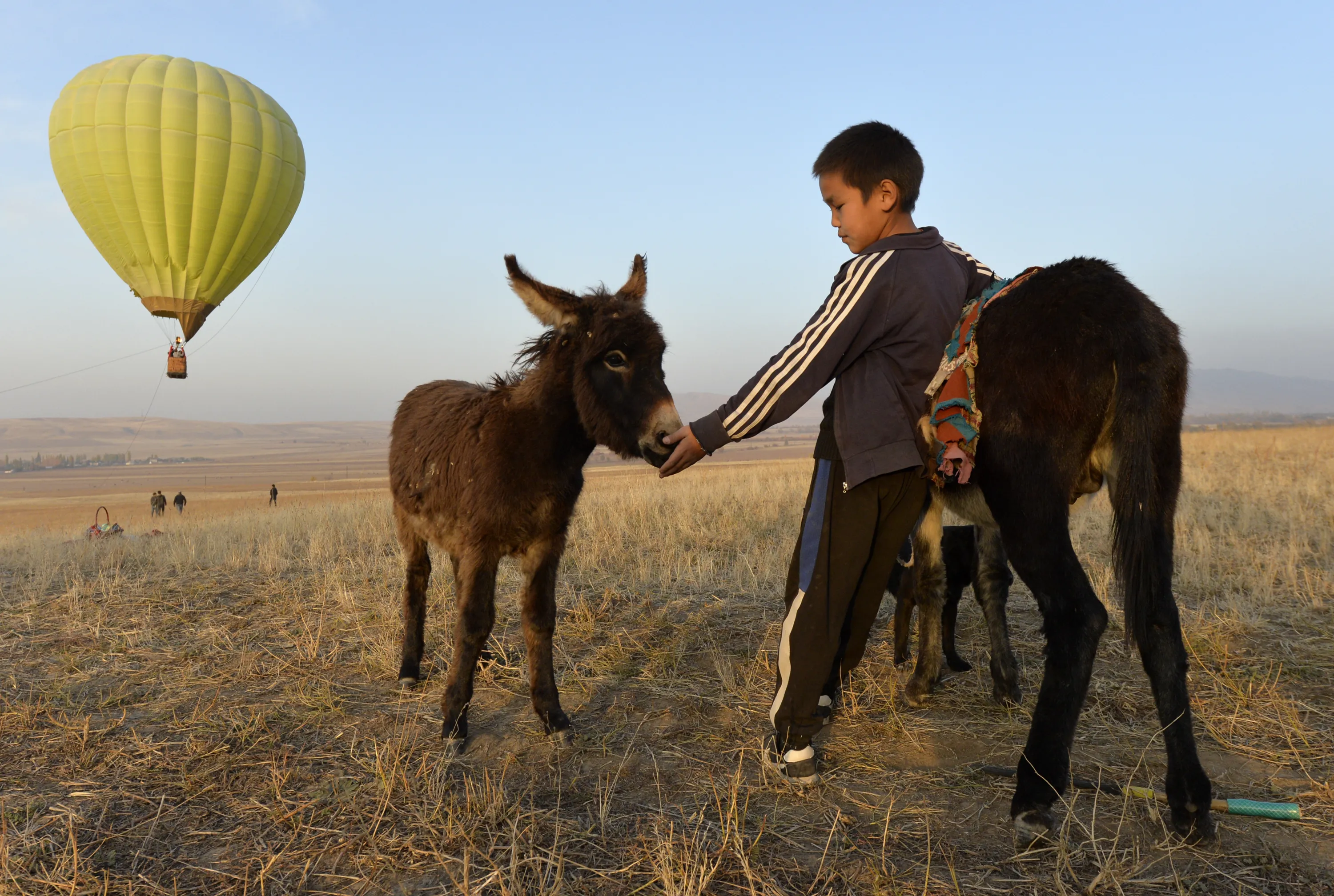 A Kyrgyz boy pets a donkey as other people launch a balloon at sunset outside Tash-Dyobyo village, 12 kilometers (7,5 miles) south of Bishkek, Kyrgyzstan, Saturday, October 17, 2020. The political turmoil that has gripped Kyrgyzstan hasn’t reached this quiet village in the mountains near the capital, where residents talk about the country’s feuding elites with resignation and disdain. (Photo by Vladimir Voronin/AP Photo)