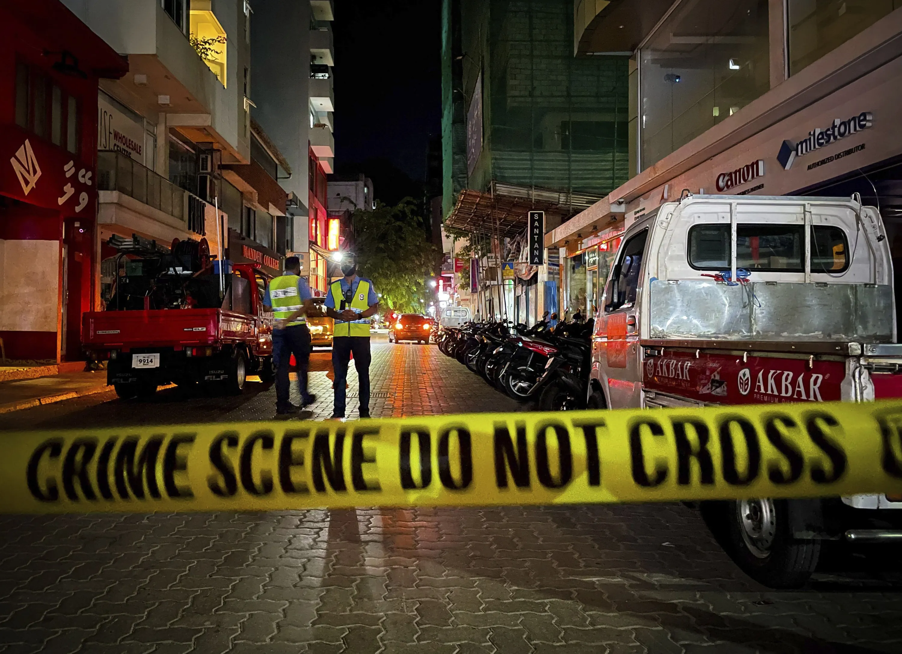 Maldivian police officers secure the area following a blast in Male, Maldives, Thursday, May 6, 2021. Maldives' first democratically elected president and current Parliament Speaker Mohamed Nasheed has been injured in a blast Thursday near his home and was being treated in a hospital in the capital, police said. (Photo by Mohamed Sharuhaan/AP Photo)