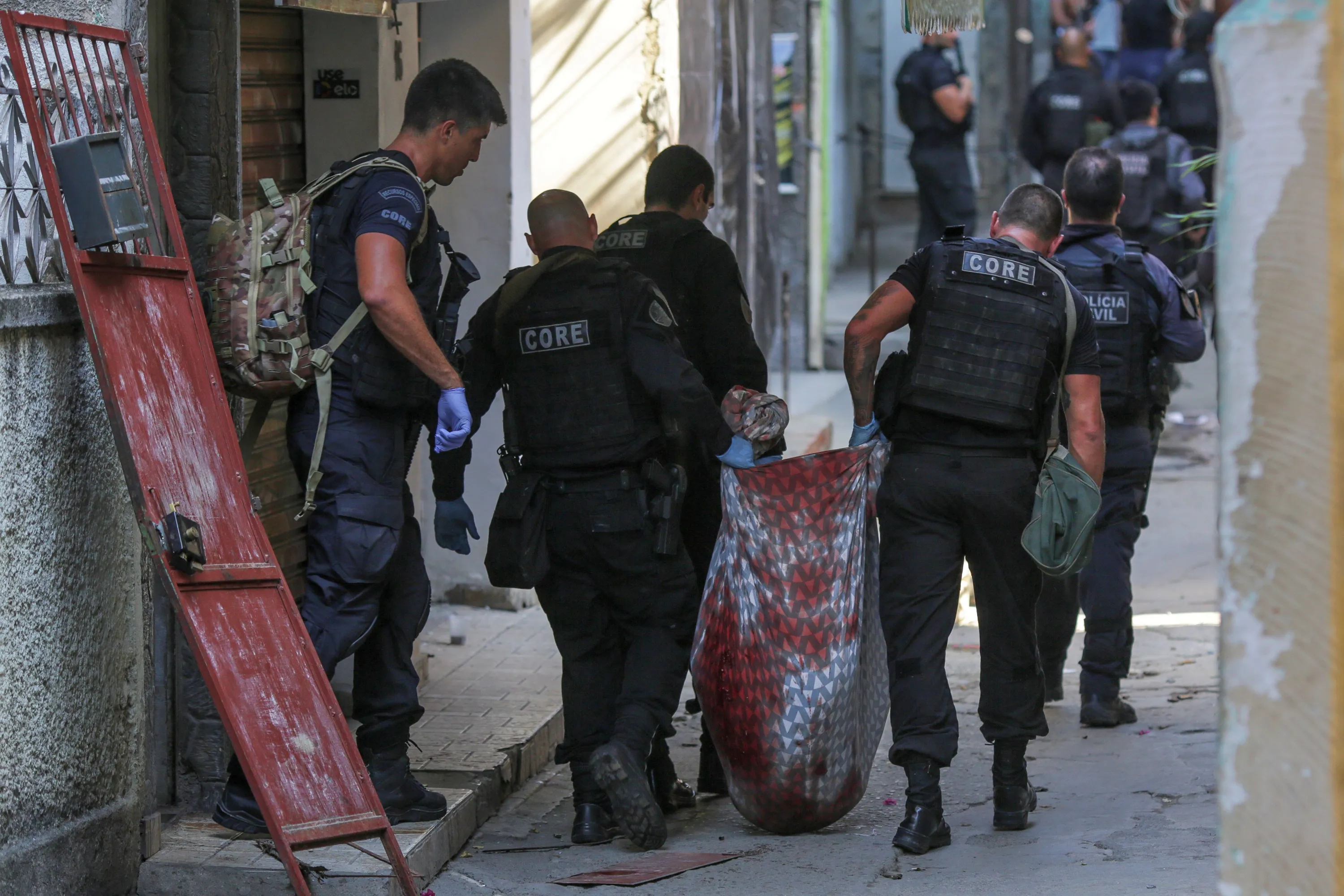 Members of the Police carry a body during a police operation against a gang of drug traffickers, in the Jacarezinho favela of Rio de Janeiro, Brazil, 06 May 2021. At least 25 people died, including a police officer, and another 5 were injured, two of them when they were mobilizing in the subway, during a police operation this 06 May against a gang of drug traffickers in a Rio de Janeiro favela, local media reported. (Photo by Andre Coelho/EPA/EFE)