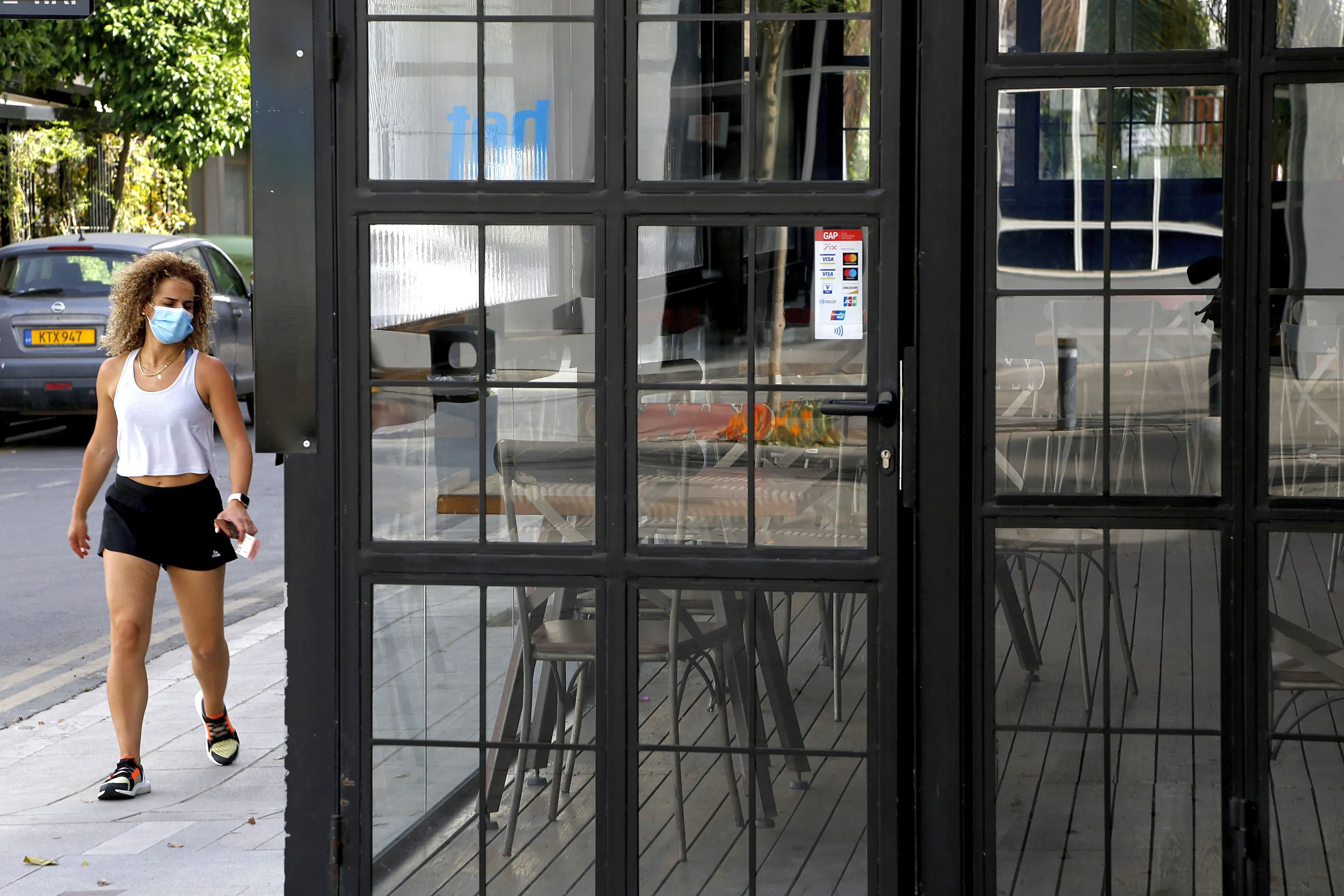 A woman wearing protective face mask walks outside of a closed cafe amid COVID-19 pandemic restrictions government in central capital Nicosia, Cyprus, Thursday, May 6, 2021. Cyprus has unveiled a phased rollback of COVID-19 lockdown restrictions over the next month including a shortened curfew and a reopening of all schools next week, but will enforce the compulsory display of proof of vaccination, virus testing or convalescence from the disease in areas were people gather in numbers, including restaurants and churches. (Photo by Petros Karadjias/AP Photo)