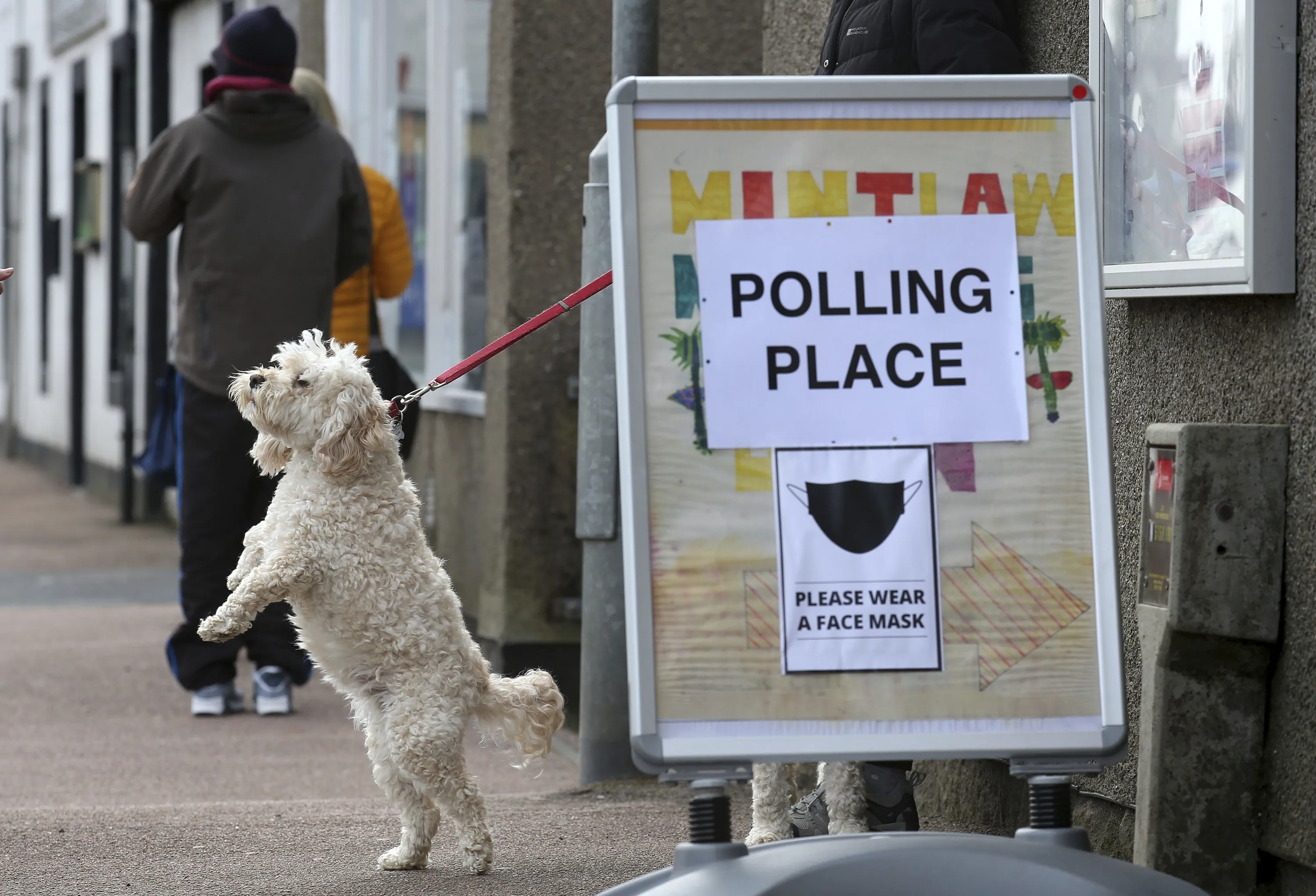 A dog tied up outside a polling station in Mintlaw, Scotland, Thursday May 6, 2021. Scots are heading to the polls to elect the next Scottish Government – though the coronavirus pandemic means it could be more than 48 hours before all the results are counted. (Photo by Andrew Milligan/PA Wire via AP Photo)