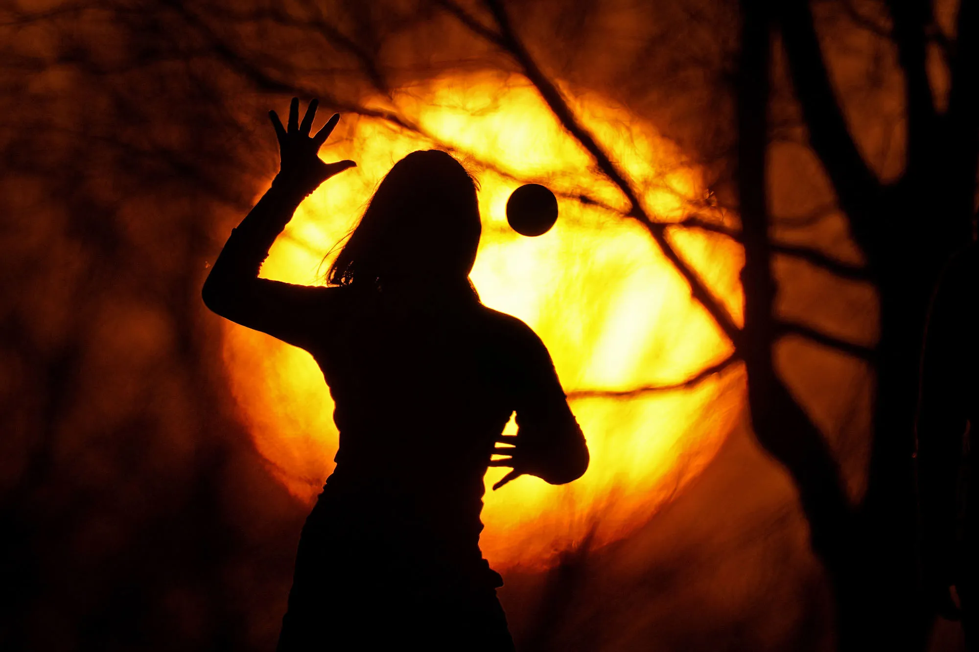 A girl is silhouetted against the setting sun she plays a game with friends on a spring-like day Saturday, March 6, 2021, in Kansas City, Mo. (Photo by Charlie Riedel/AP Photo)