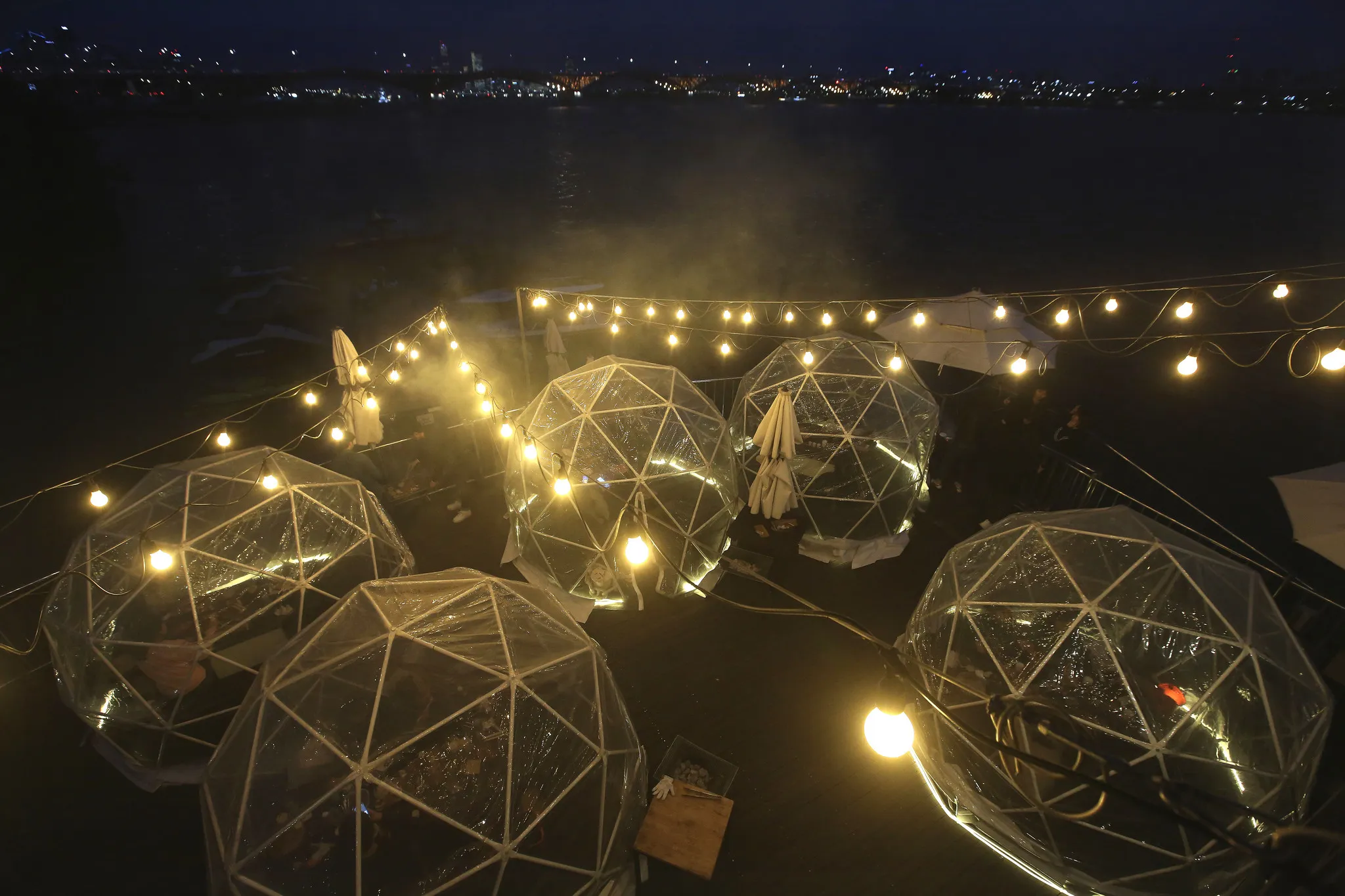 People enjoy outdoor dining at plastic bubbles, observing social distancing against the spread of the coronavirus at a restaurant near the Han River in Seoul, South Korea, Friday, April 9, 2021. (Photo by Ahn Young-joon/AP Photo)