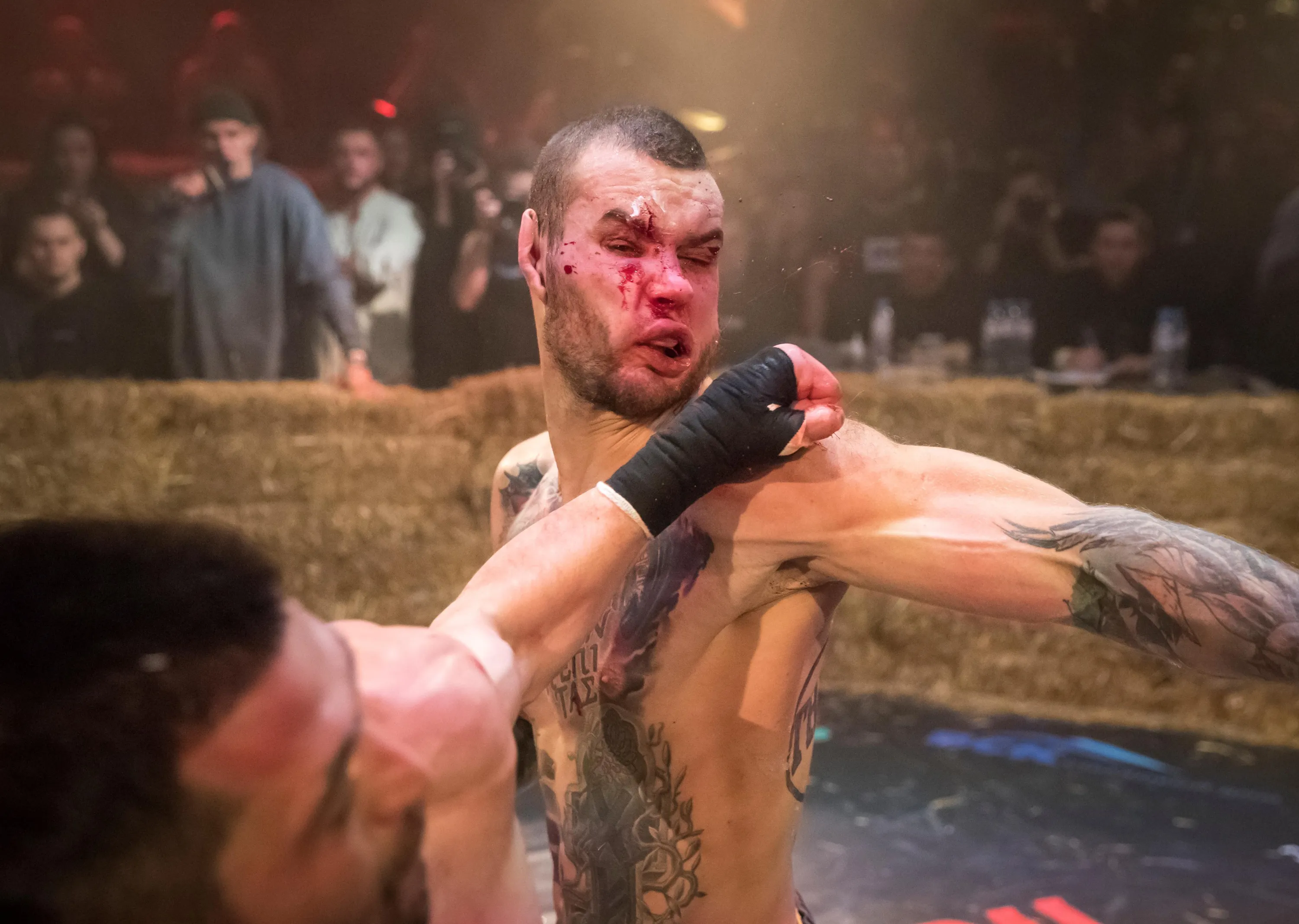 Danik Vesnenok and Danila Utenkov fight during the “Top Dog” bare-knuckle boxing tournament in Moscow, Russia on April 16, 2021. The fights are split by gender for women and men and involve three two-minute rounds. The rings are circled by haystacks and often covered in blood by the end. The organizers reject criticism that the bouts are dangerous for athletes. They say they receive flesh wounds that heal, while gloved boxers are able to receive more punches, which exposes them to longer-term problems such as brain damage. (Photo by Shamil Zhumatov/Reuters)