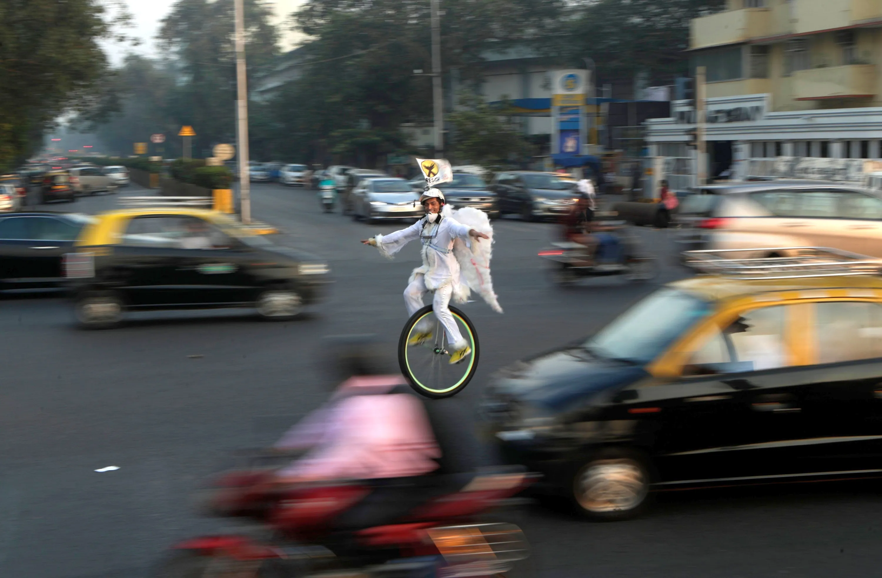 Ibrahim Khan rides a unicycle as he tours the city to create awareness about dangers posed to birds during kite flying, a popular way to mark Makkar Sankranti festival, in Mumbai, India, Tuesday, January 12, 2021. Makar Sankranti will be celebrated across the country on Jan. 14. (Photo by Rajanish Kakade/AP Photo)