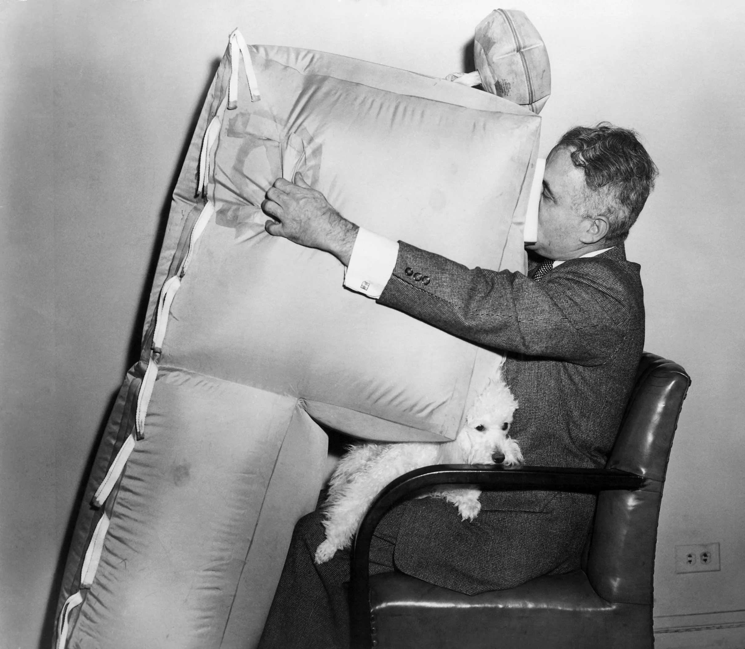Happier landing for airplane survival crash victims is the purpose of the Micro-Moisture pneumatic safety cushion demonstrated by its designer, Assen Jordanoff, a pioneer aviator, on January 4, 1957. The cushion, which is being studied by military and civil aviation authorities, is installed in the back of airplane seats. By throwing a single switch, the pilot can inflate a planeful in three seconds. The French poodle shows how a child on a parent's lap would be protected from the crushing jolt of a crash landing or ditching. (Photo by AP Photo)