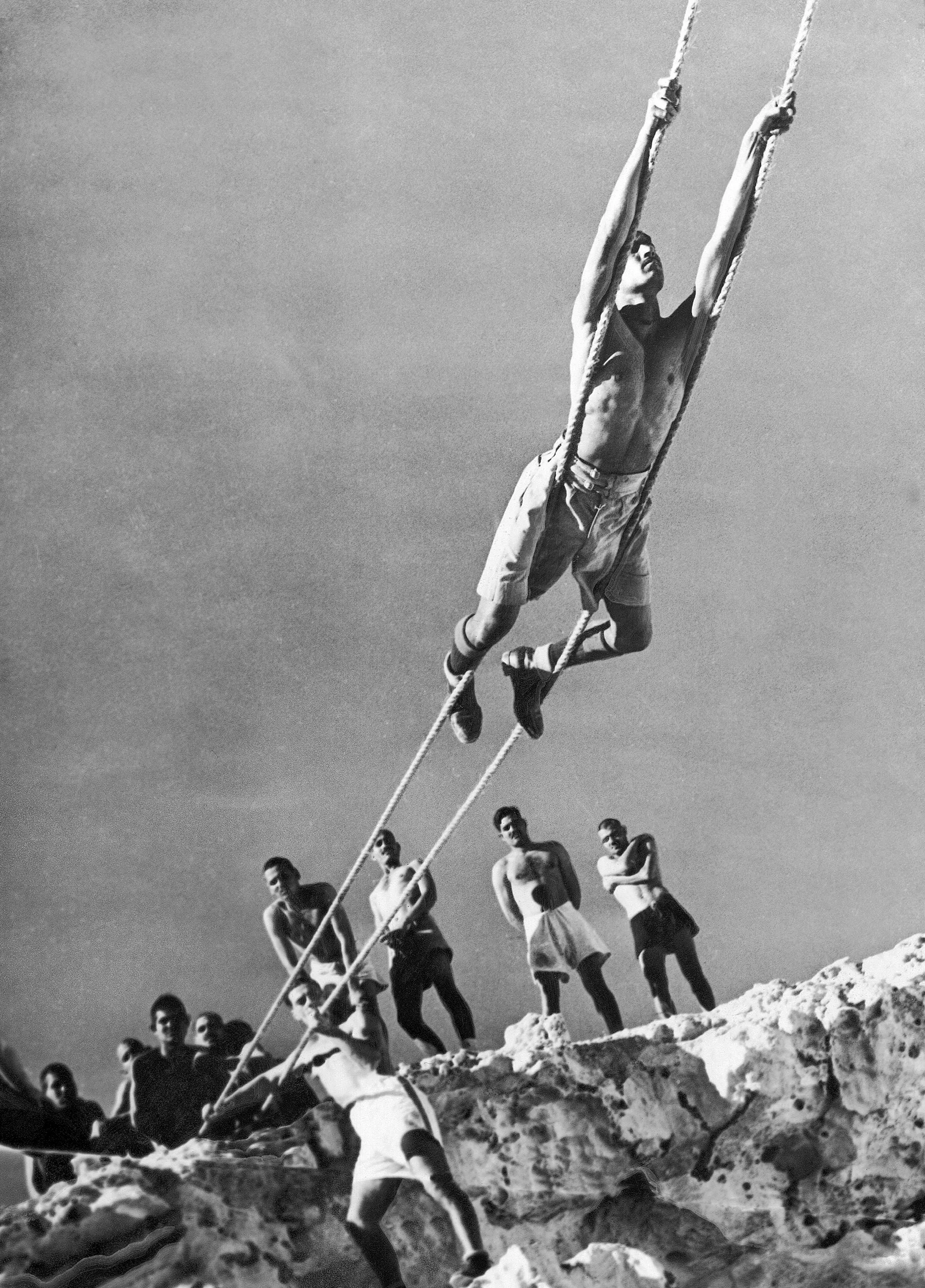 The Indian Armoured Corps. formations of this Corps have fought with distinction in the campaigns in the Middle East, and the Far East, and are now engaged in fighting in Italy. An Indian Armoured Formation somewhere in the Middle East. Indian troops doing P. T. training; rope scaling March 15, 1944. (Photo by AP Photo)