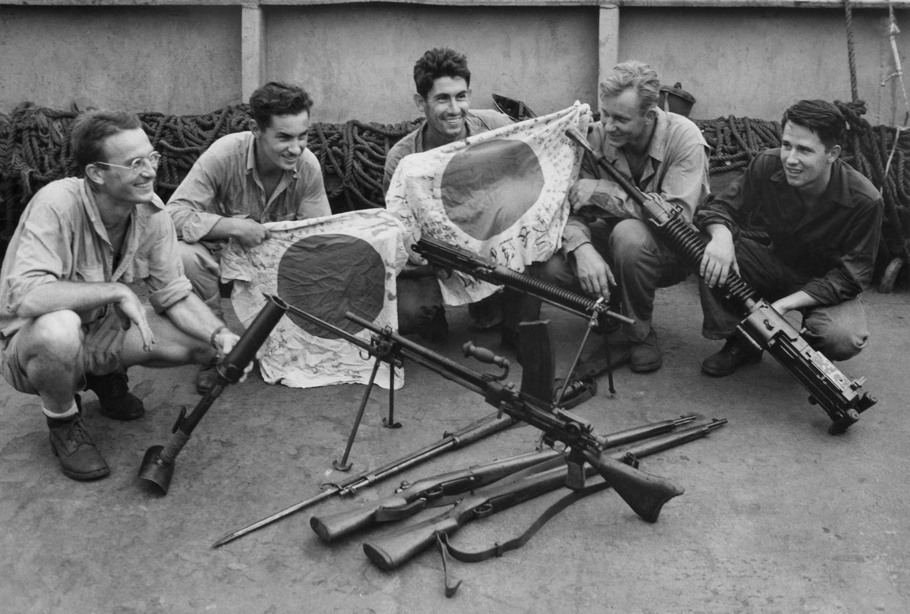 Five fighting Coast Guardsmen, who participated in the initial landing on Manus Island in the Admiralties, display Japanese trophies picked up during the swift occupation of that South Pacific stronghold. Their souvenirs include a Japanese knee mortar, flags, light machine guns, rifles, and a Japanese 25 caliber “woodpecker” on May 24, 1944. Left to right, the Coast Guardsmen are: Eric S. Wessborg, Jr., chief boatswain's mate, of Richland, Mich.; William Knight, chief quartermaster, of Oakland, Calif.; Ralph E. DeChevrieux, gunner's mate second class, of Long Beach, Calif.; John E. Schoewe, coxswain, of Milwaukee, Wis.; and Harold A. Mayer, pharmacist's mate first class, of Yankton, S.D. (Photo by AP Photo)