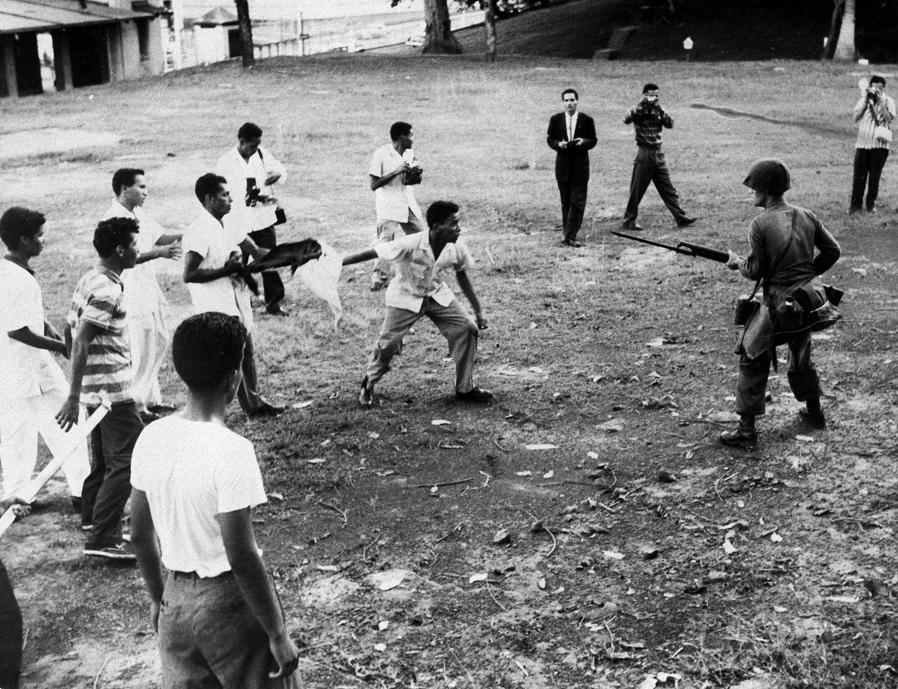 A lone U.S. soldier stands his ground against taunting Panamanian youths in Panama, November 29, 1959 as they attempted to cross into the Canal Zone and plant the Panama flag. U.S. troops were called on to back up the Panama National Guard in holding back the demonstrators. Panamanian photographers in the background photograph the action. (Photo by AP Photo)