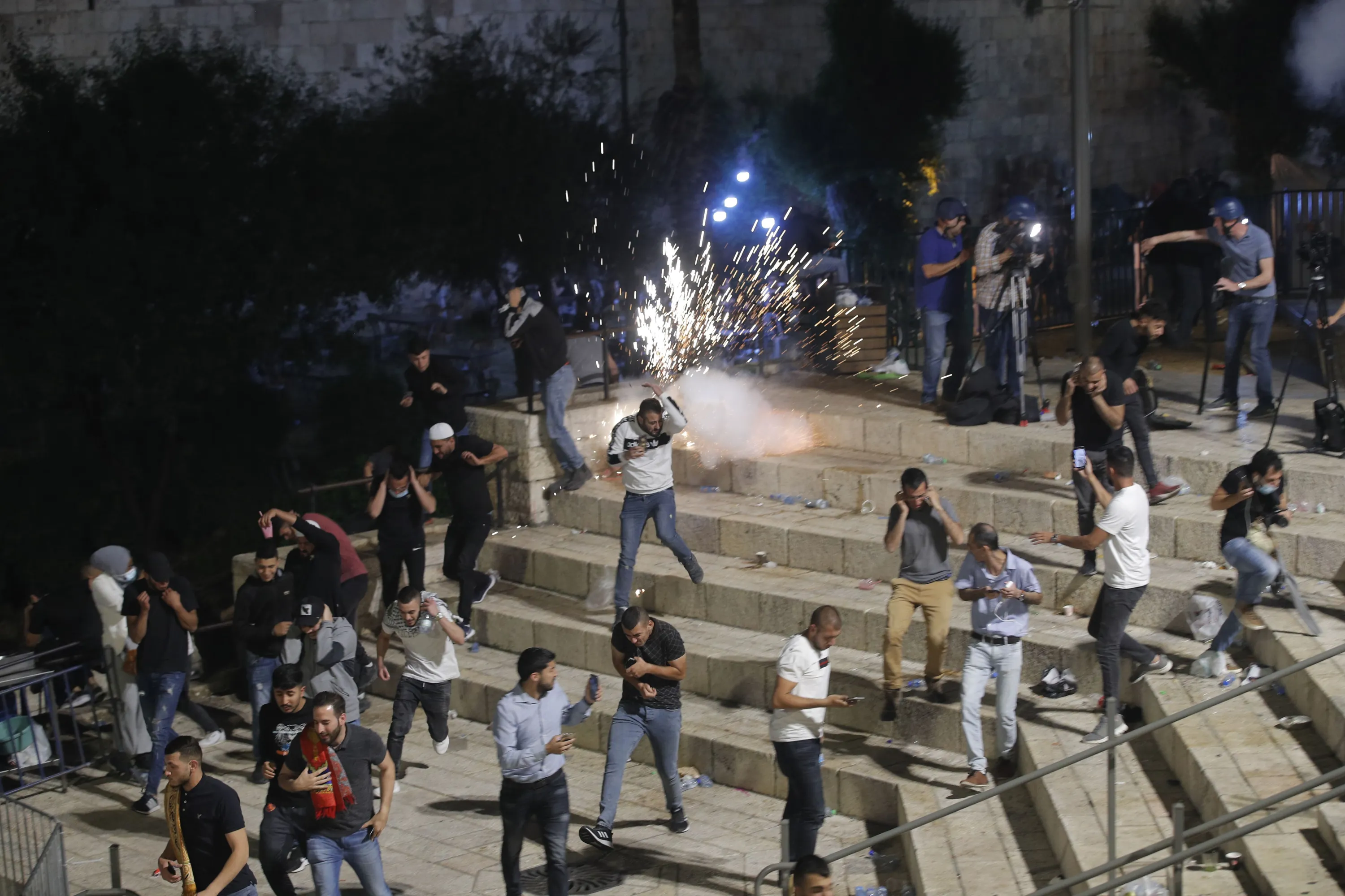 Palestinians run from stun grenades fired by Israeli police officers during clashes at Damascus Gate just outside Jerusalem's Old City, Saturday, May 8, 2021. Israeli police on Saturday clashed with Palestinian protesters outside Jerusalem's Old City during the holiest night of Ramadan, in a show of force that threatened to deepen the holy city's worst religious unrest in several years. (Photo by Oded Balilty/AP Photo)