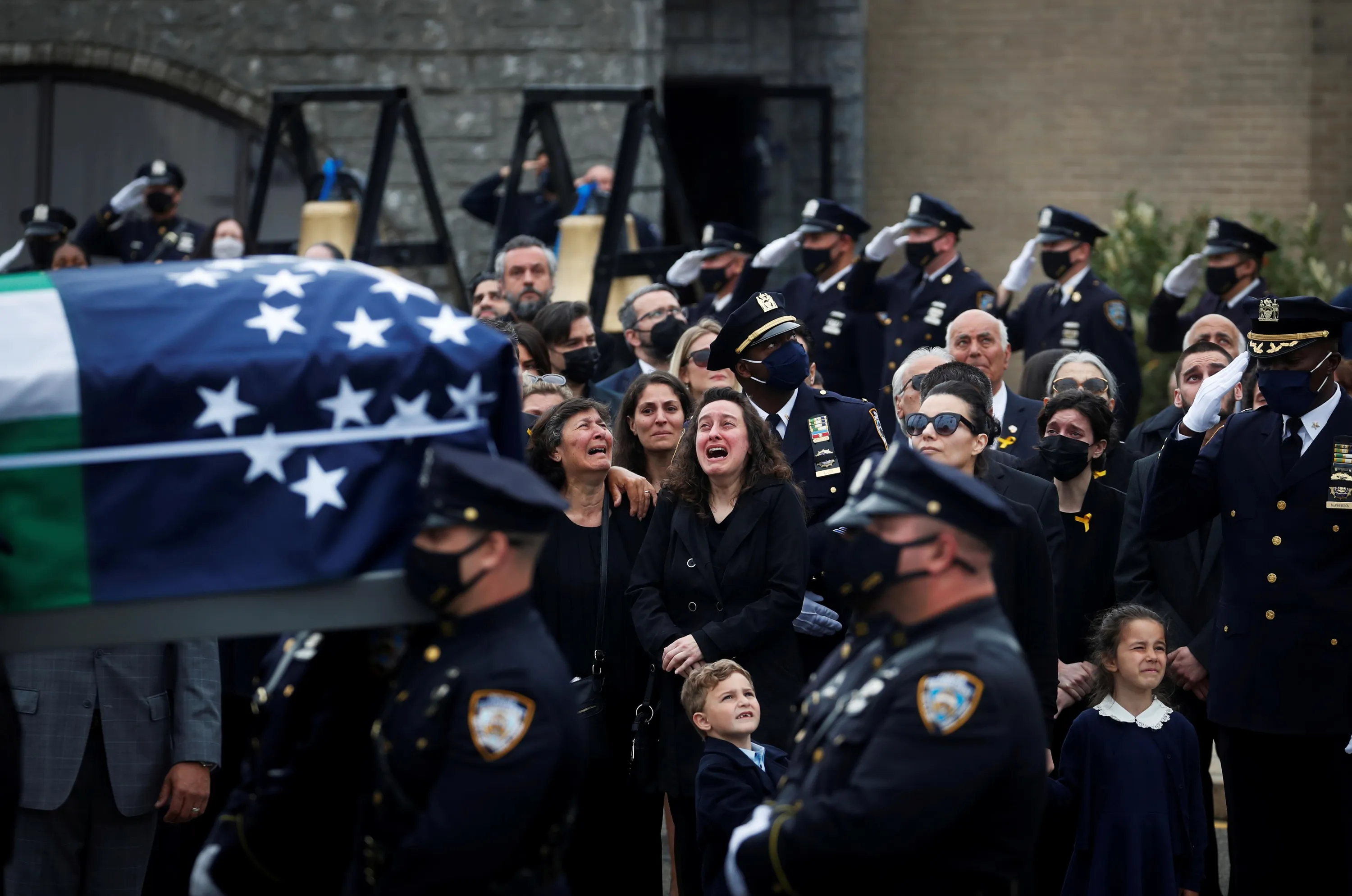 The family of New York Police Department (NYPD) officer Anastasios Tsakos, who was killed in the line of duty on April 27, 2021, by an impaired driver while responding to a highway crash, reacts as his casket is carried from his funeral service in Greenlawn, New York, U.S., May 4, 2021. (Photo by Shannon Stapleton/Reuters)
