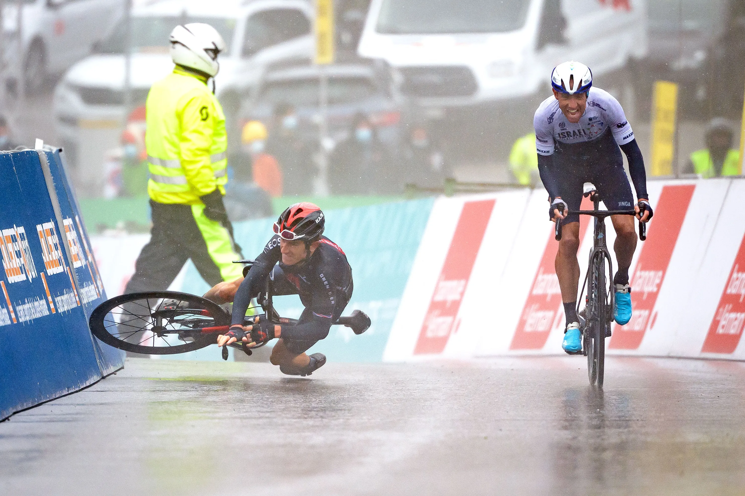 Britain's Geraint Thomas (L) falls next to winner Canada's Michael Woods prior to the arrival of the stage 5, 161.3 km, from Sion to Thyon 2000, during the Tour de Romandie UCI World Tour 2021 cycling race on May 1, 2021 in Thyon. (Photo by Fabrice Coffrini/AFP Photo)