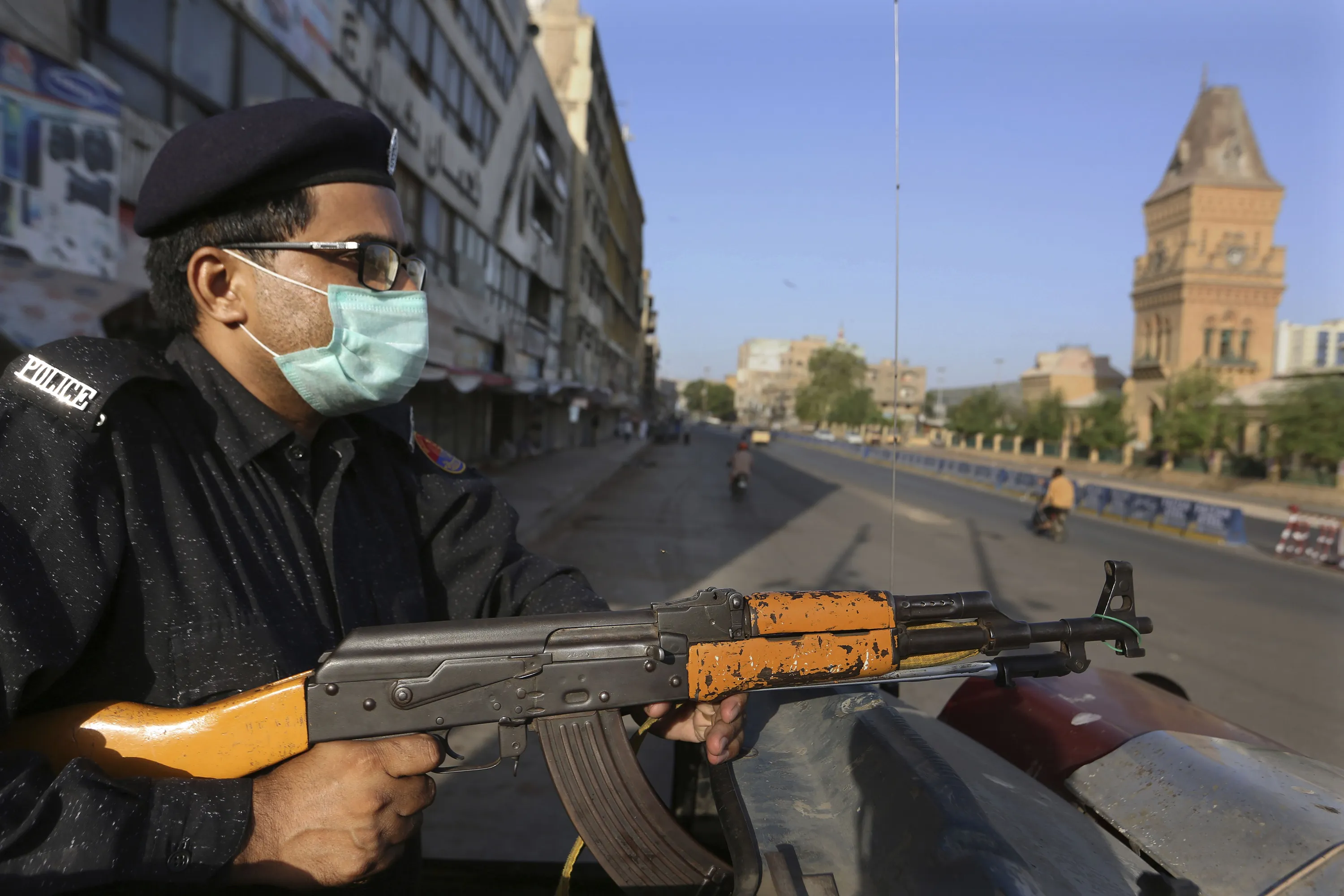 A police officer stands guard in a business district to ensure a lockdown to help control the spread of the coronavirus, in Karachi, Pakistan, Sunday, May 9, 2021. (Photo by Fareed Khan/AP Photo)