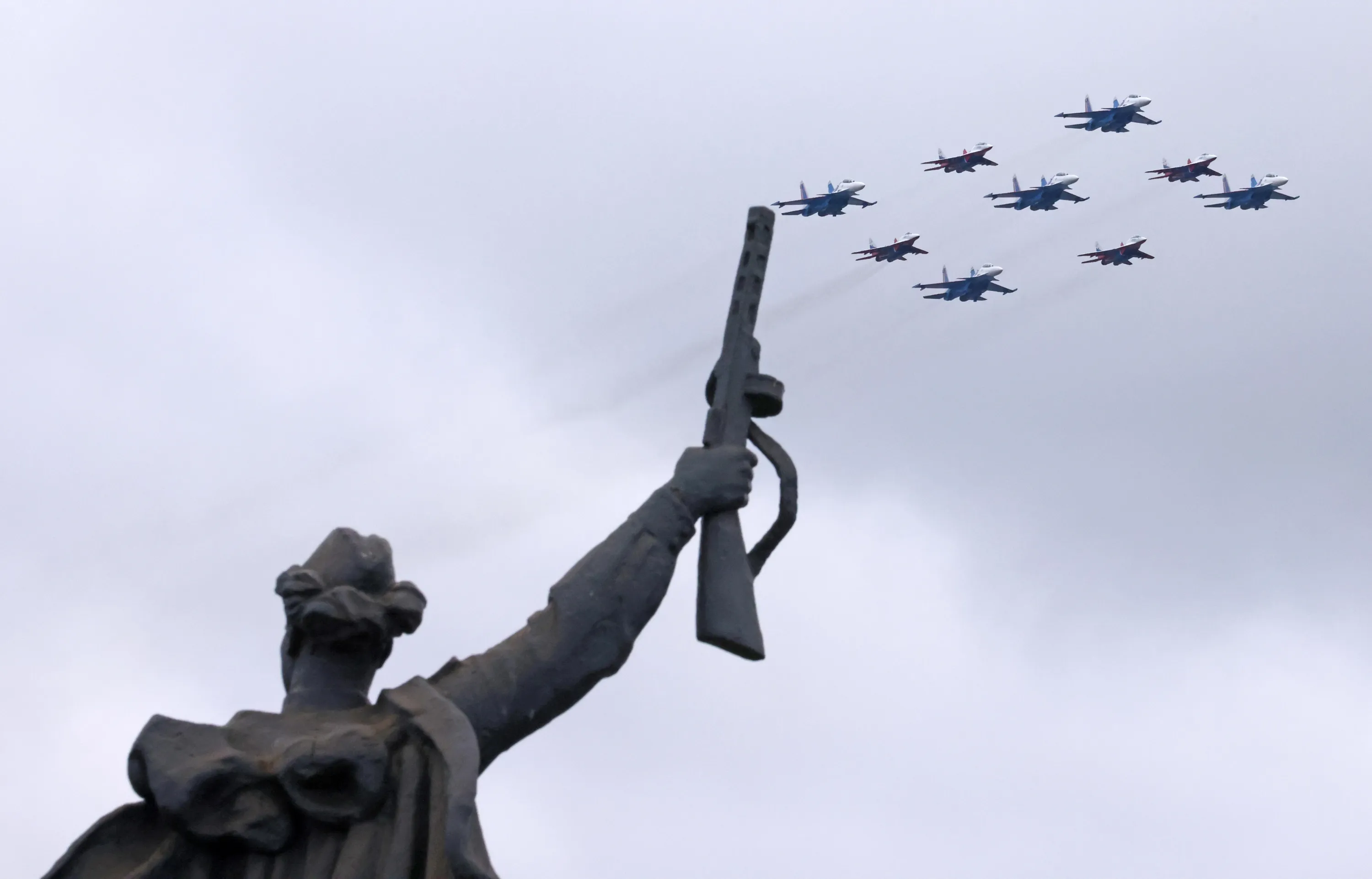 Russian army MiG-29 jet fighters of the Strizhi (Swifts) and Su-30SM jet fighters of the Russkiye Vityazi (Russian Knights) aerobatic teams fly in formation during a flypast, which is part of a military parade on Victory Day marking the 76th anniversary of the victory over Nazi Germany in World War Two, in central Moscow, Russia on May 9, 2021. (Photo by Tatyana Makeyeva/Reuters)