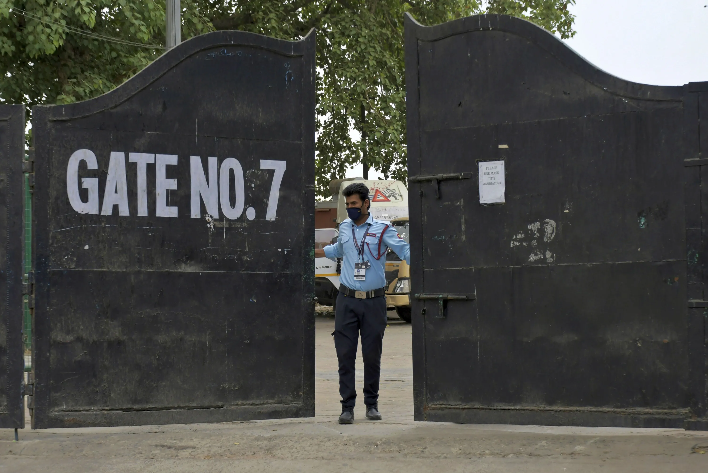 A security guard closes the gate of Arun Jaitley Stadium, one of the six venues of Indian Premier League 2021, in New Delhi, India, Tuesday, May 4, 2021. The Indian Premier League was suspended indefinitely on Tuesday after players or staff at three clubs tested positive for COVID-19 as nationwide infections surged. (Photo by Ishant Chauhan/AP Photo)