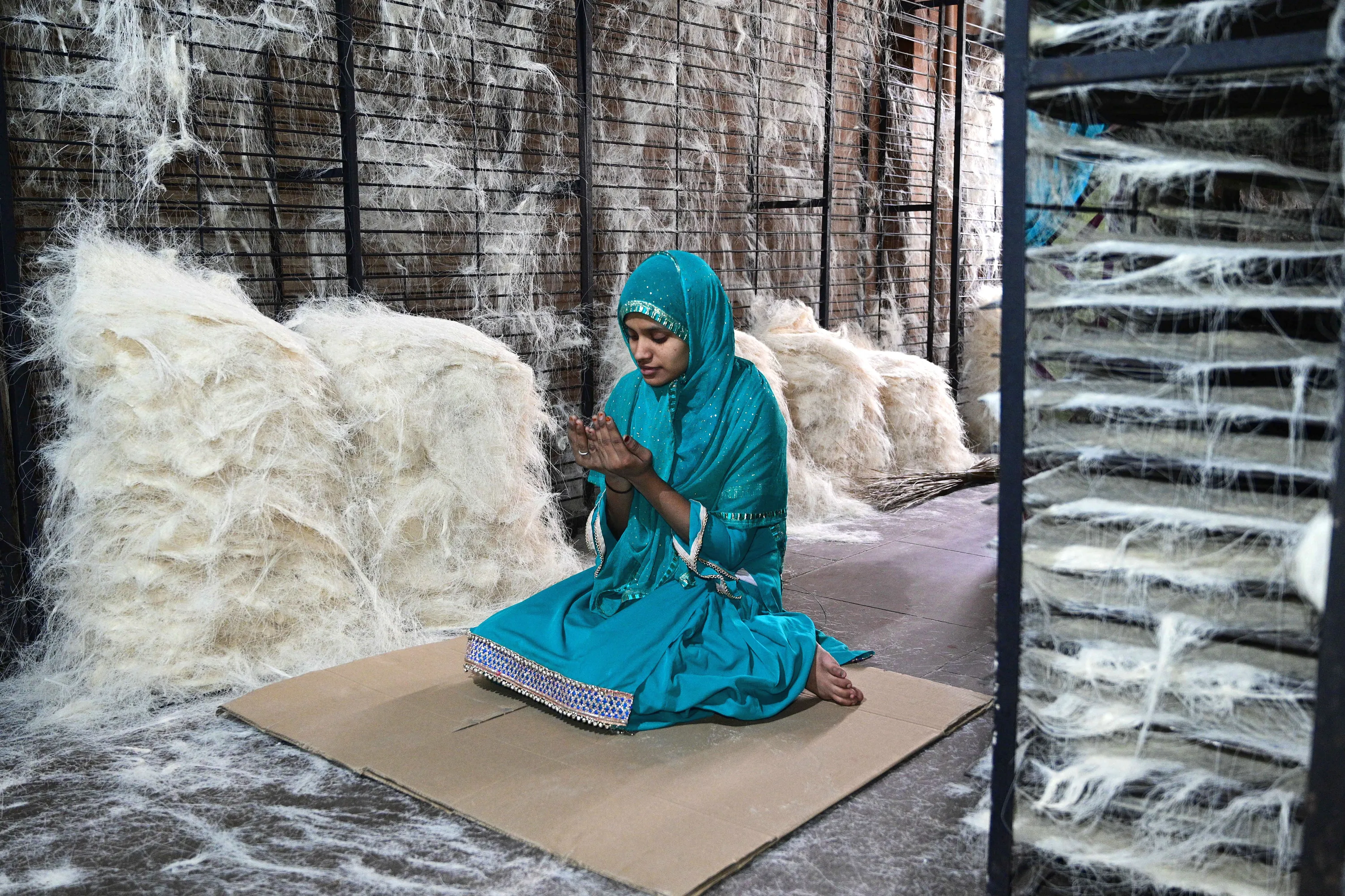 A labour offer prayer on the last Friday of Ramzan month at a vermicelli factory in Prayagraj on Friday, May 07, 2021. (Photo by Prabhat Kumar Verma/ZUMA Wire/Rex Features/Shutterstock)
