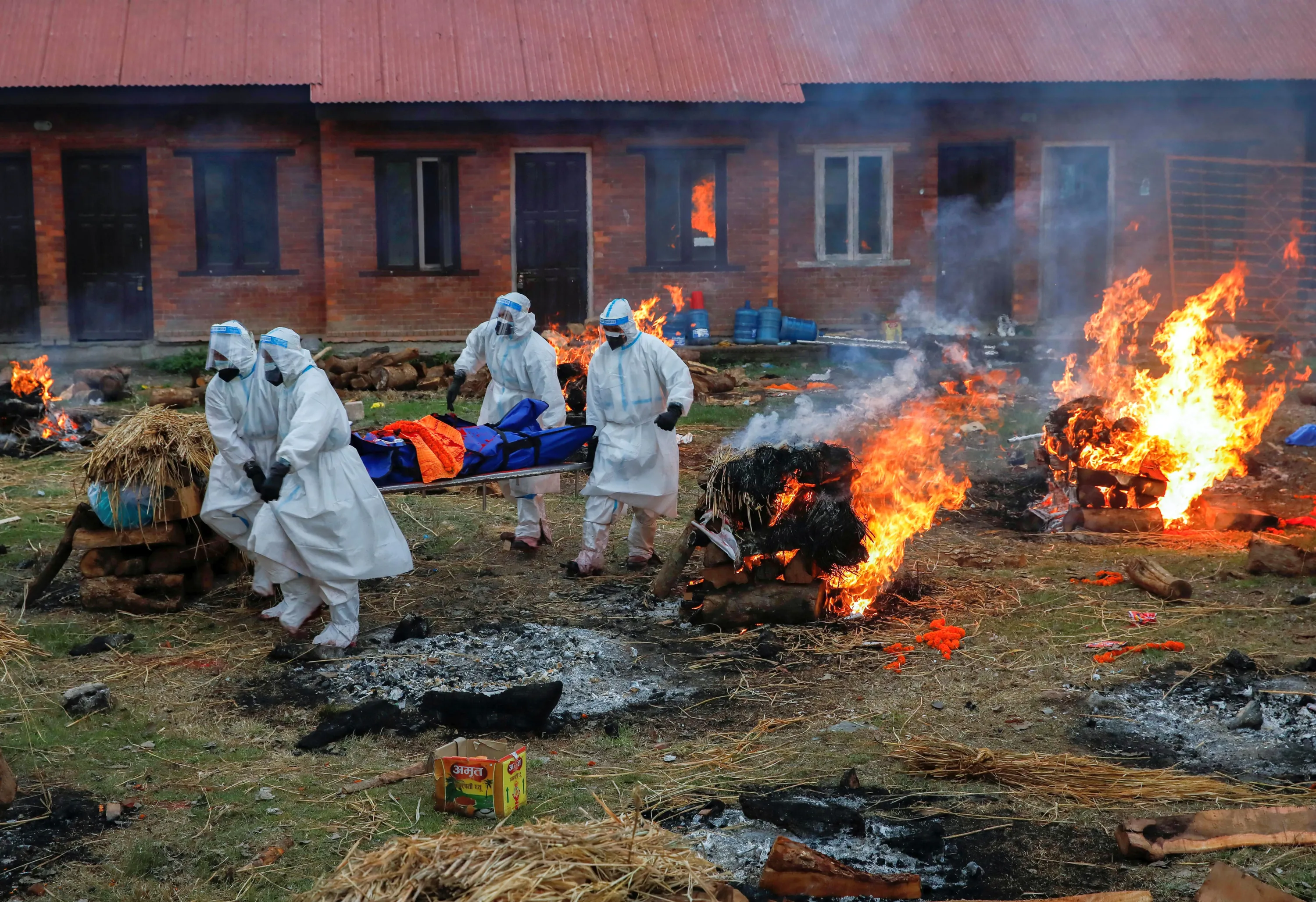 Members of Nepal Army in personal protective equipment (PPE) carry a body of a person, who died from the coronavirus disease (COVID-19), at the crematorium, in Kathmandu, Nepal on May 11, 2021. (Photo by Navesh Chitrakar/Reuters)