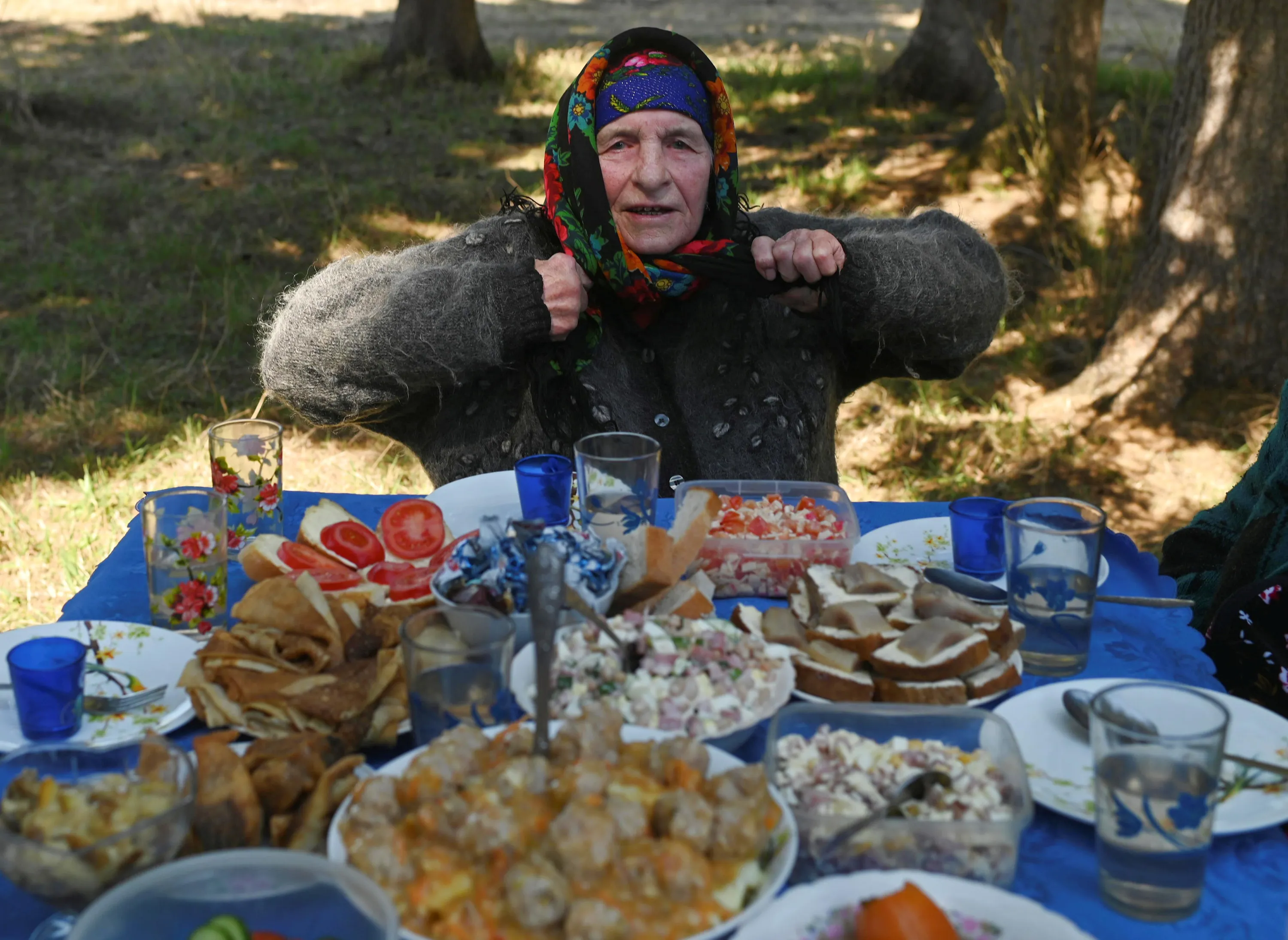 A local resident has a feast on Victory Day, which marks the 76th anniversary of the victory over Nazi Germany in World War Two, in the settlement of Sovetskaya Krestyanka in Omsk Region, Russia on May 9, 2021. (Photo by Alexey Malgavko/Reuters)