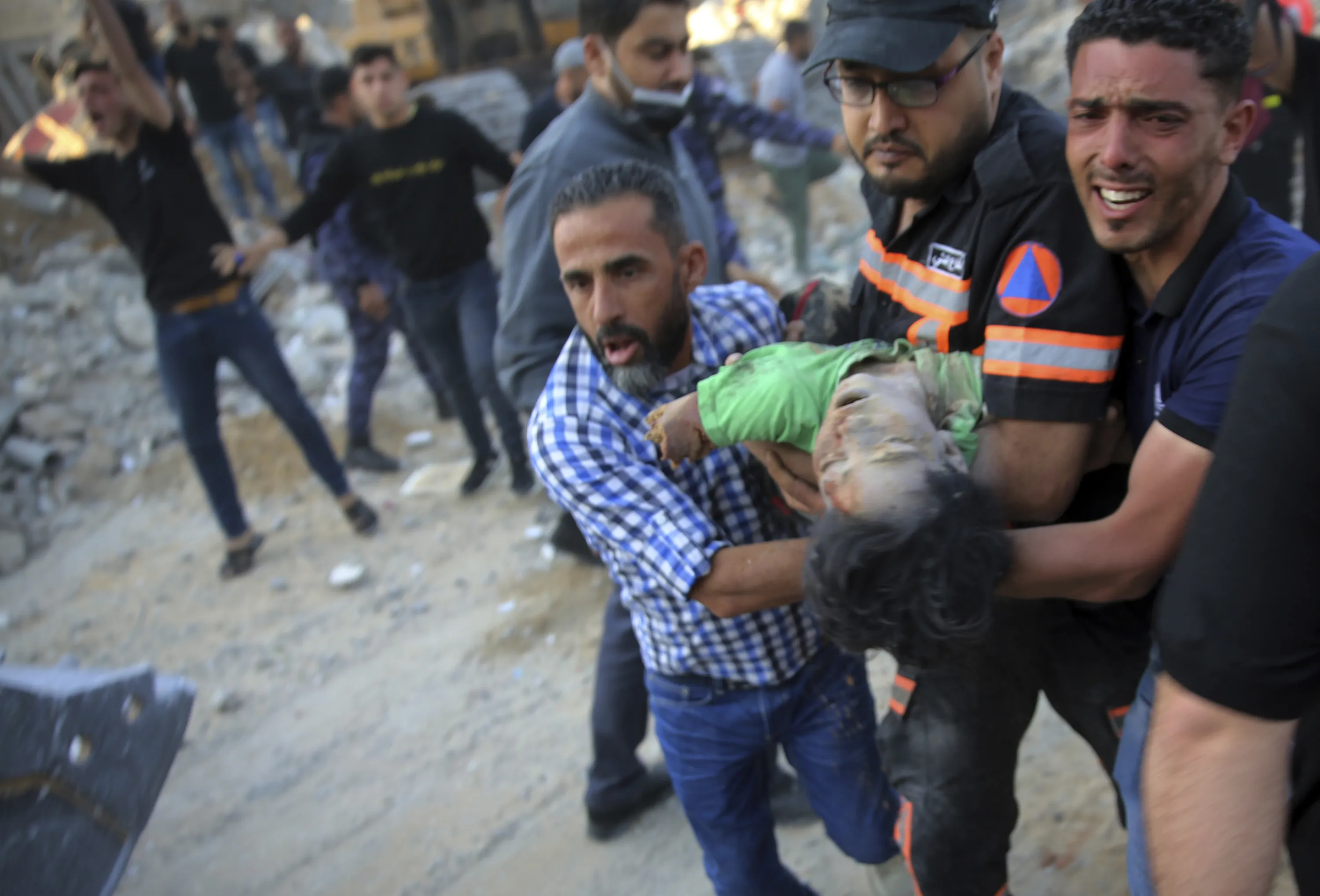 Palestinians carry the body of a child found in the rubble of a house belonging to the Al-Tanani family, that was destroyed in Israeli airstrikes in town of Beit Lahiya, northern Gaza Strip, Thursday, May 13, 2021. (Photo by Abdel Kareem Hana/AP Photo)
