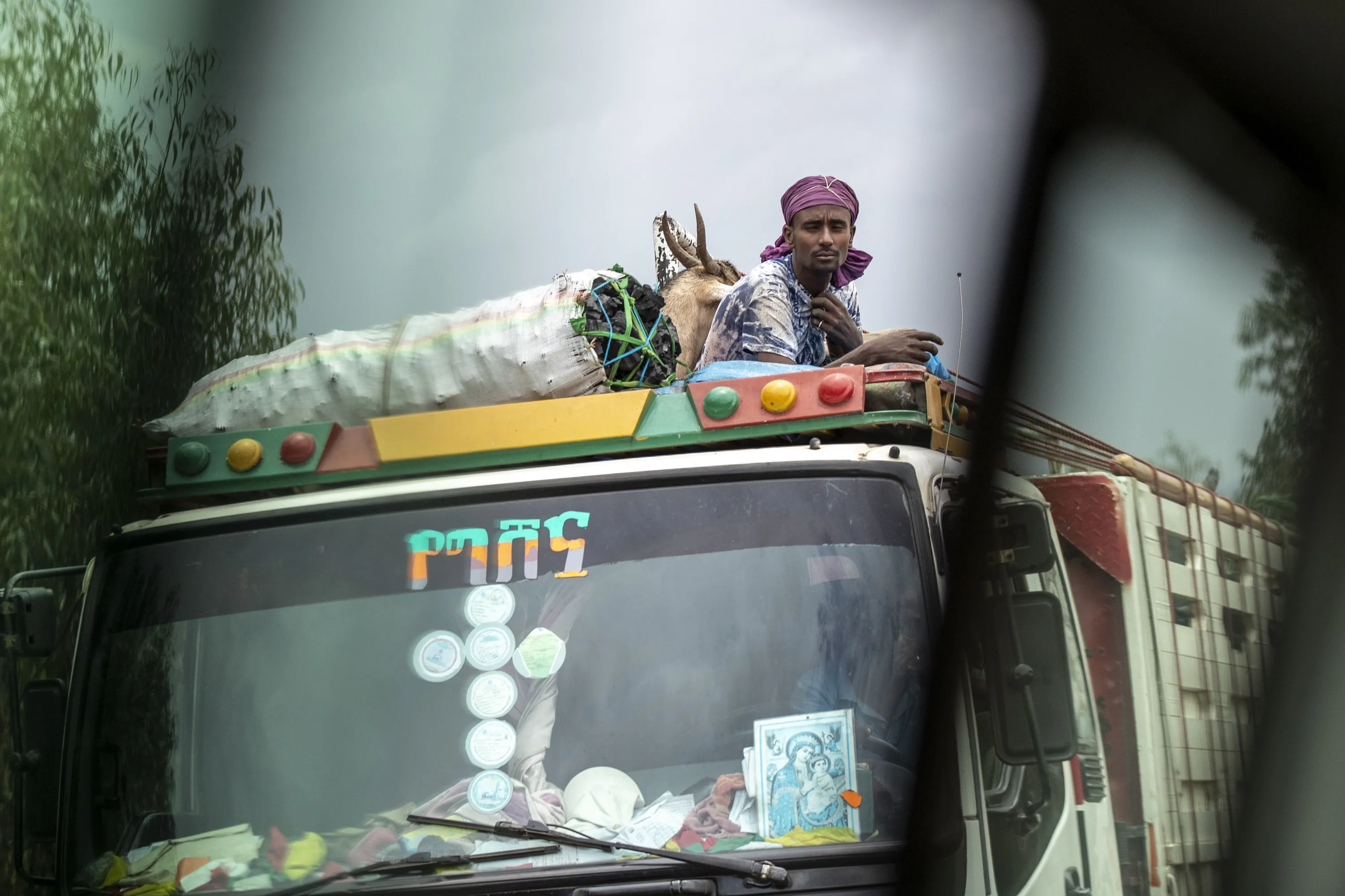 A man rides with goats and charcoal on the roof of a truck, seen through the window of a vehicle, near Danshe, a town in an area of western Tigray annexed by the Amhara region during the ongoing conflict, in Ethiopia Saturday, May 1, 2021. (Photo by Ben Curtis/AP Photo)