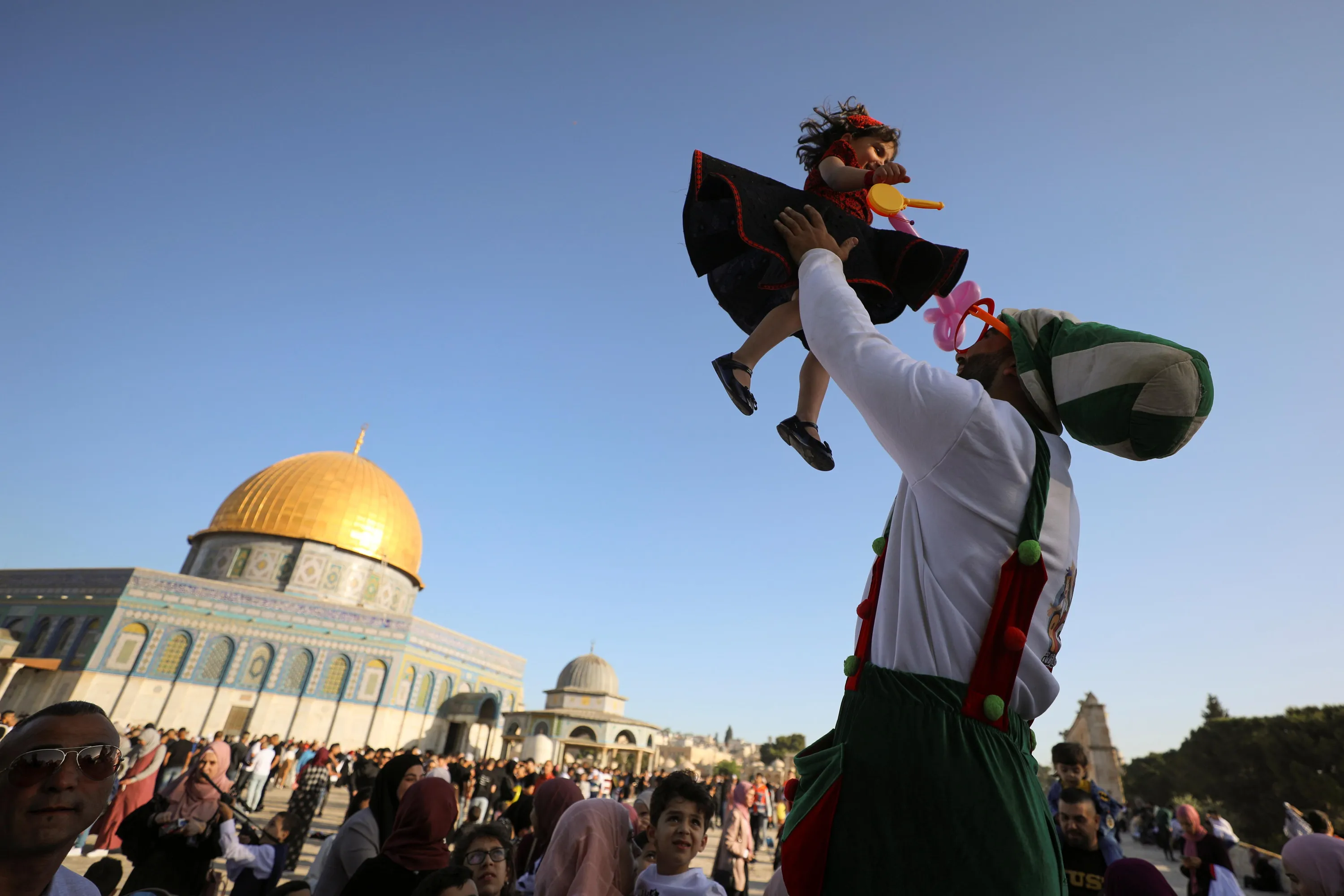 A clown plays with a young girl during Eid al-Fitr prayers, which mark the end of the holy fasting month of Ramadan, at the compound that houses al-Aqsa mosque, known to Muslims as Noble Sanctuary and to Jews as Temple Mount, in Jerusalem's Old City, amid Israel-Gaza fighting May 13, 2021. (Photo by Ammar Awad/Reuters)