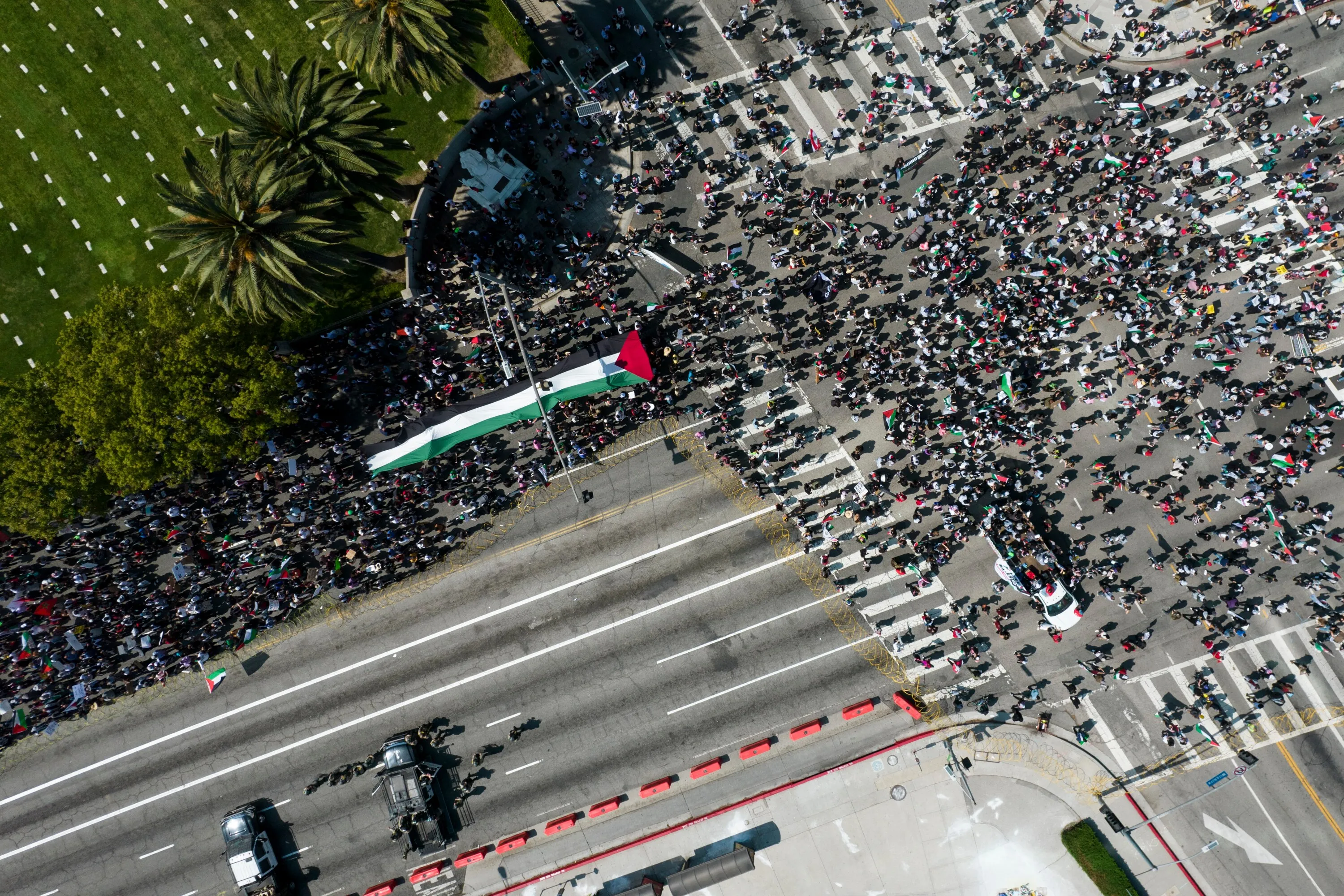 In this photo taken by a drone, thousands of demonstrators protest outside the Federal Building against Israel and in support of Palestinians, Saturday, May 15, 2021 in the Westwood section of Los Angeles. (Photo by Ringo H.W. Chiu/AP Photo)