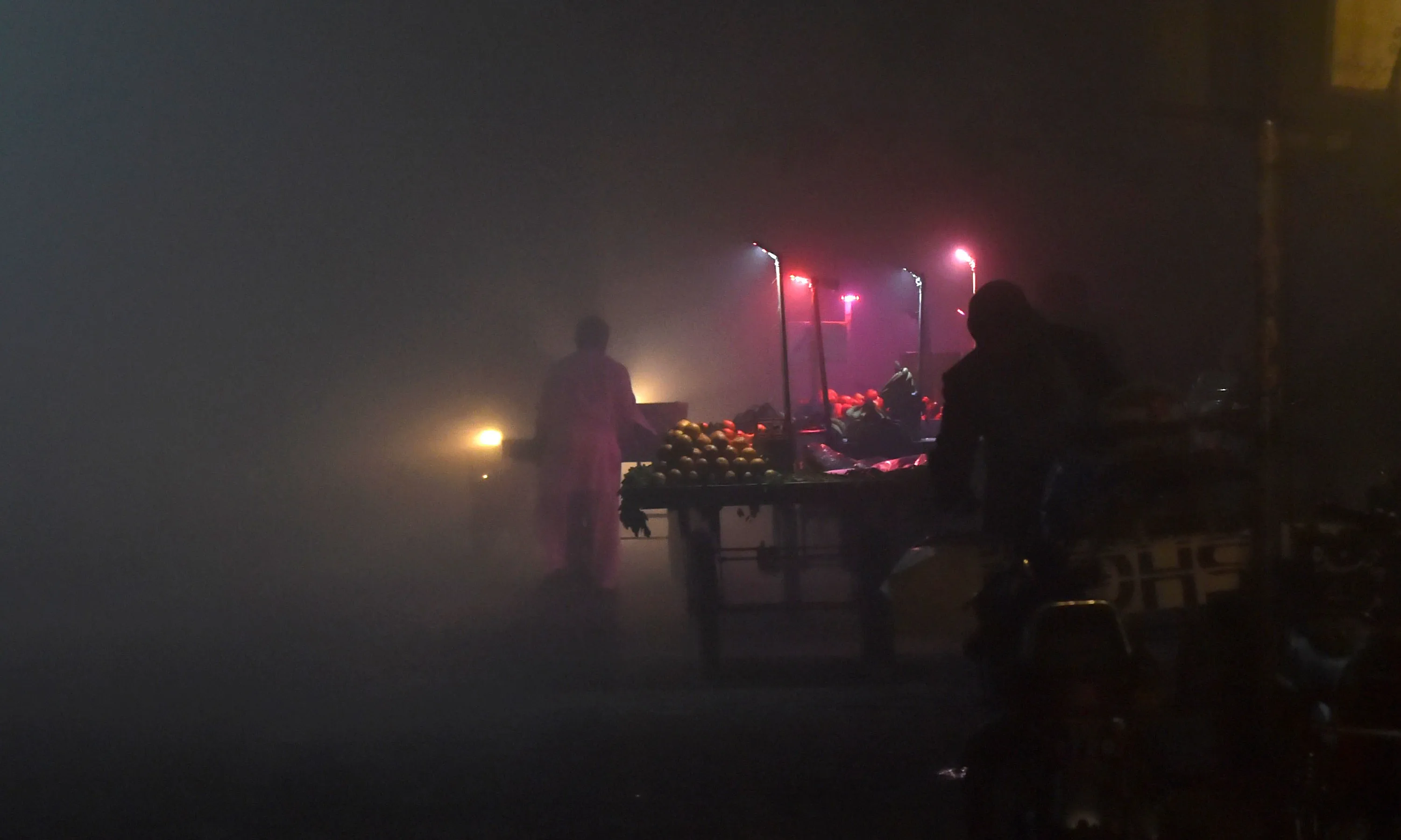 A cyclist rides past the stall of a street vendor amidst smog and fog in Lahore on December 26, 2020. (Photo by Arif Ali/AFP Photo)