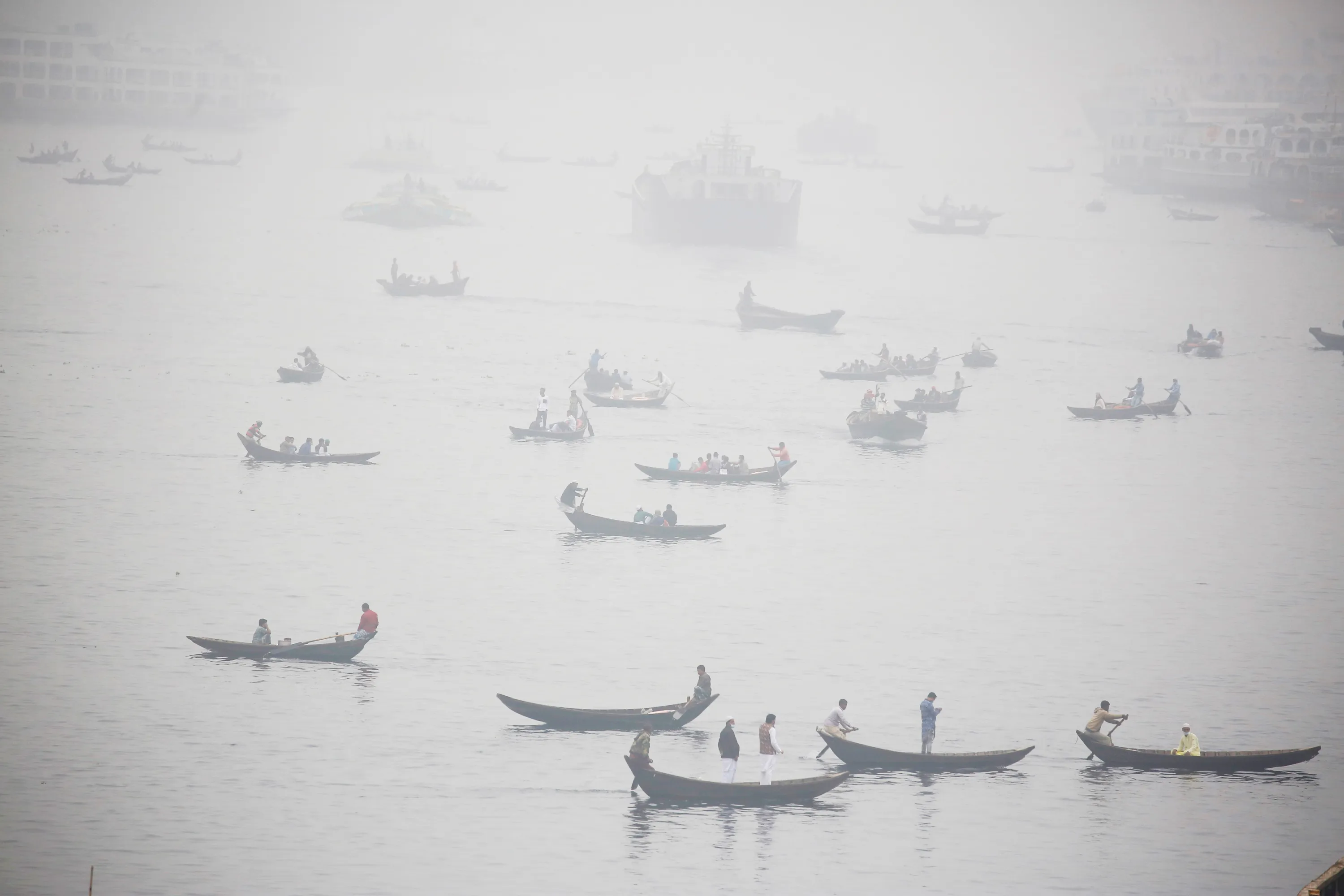 People cross the Buriganga River in boats during the winter on a foggy day in Dhaka, Bangladesh on 11 December 2020. (Photo by Monirul Alam/EPA/EFE)