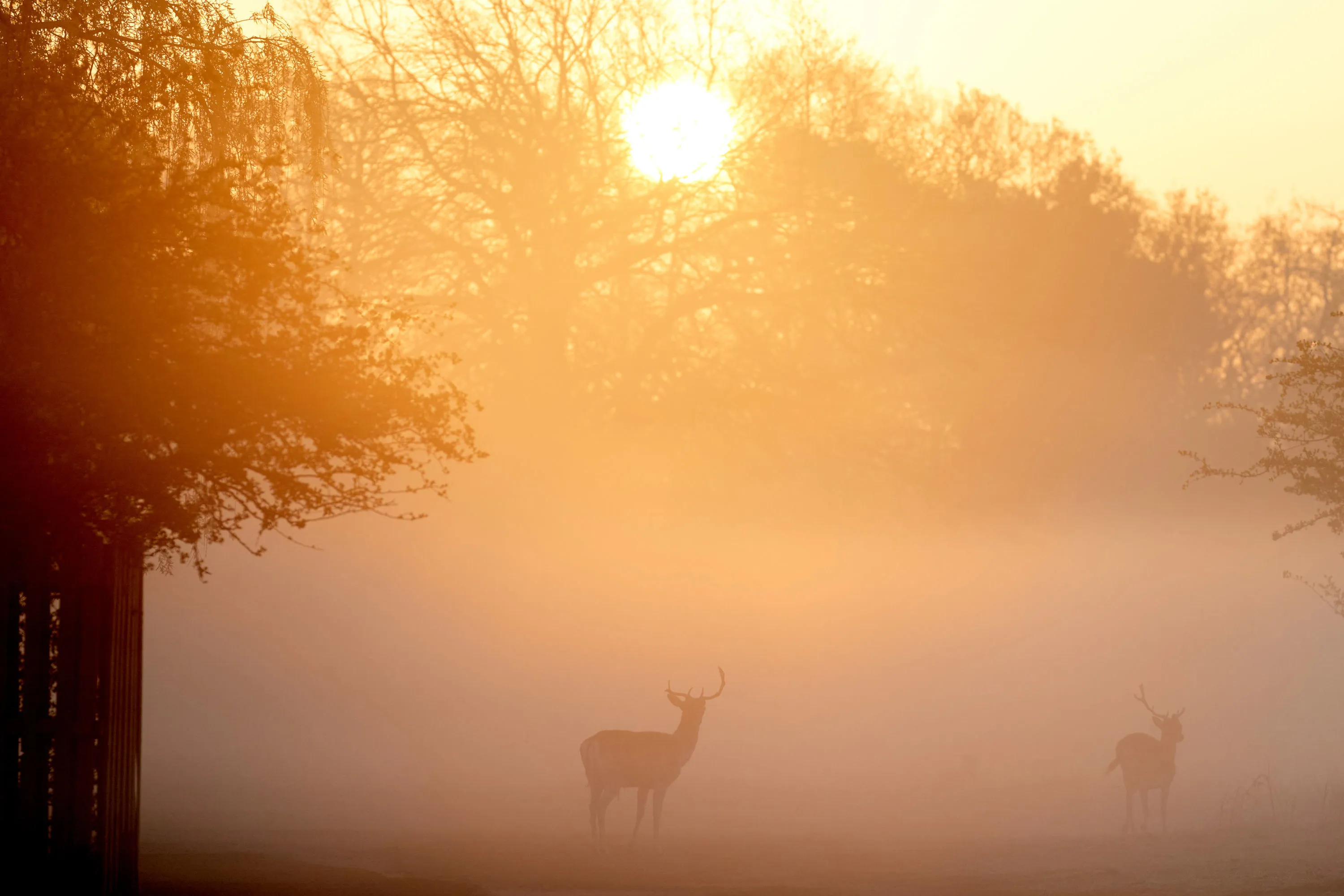 Deer are silhouetted against the mist and the early morning sun in Bushy Park, London on Monday, April 19, 2021. (Photo by John Walton/PA Images via Getty Images)