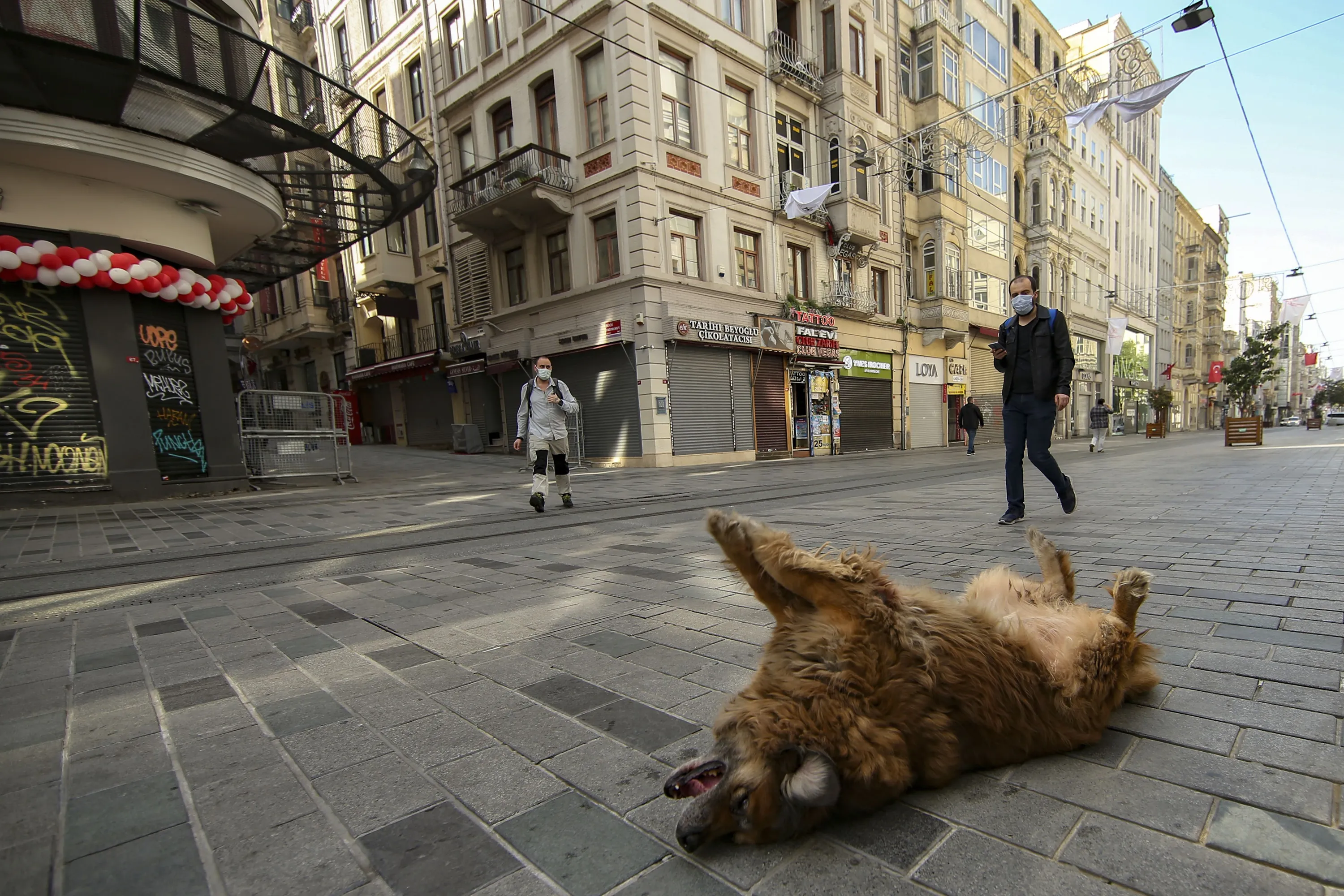 A dog lays on a virtually empty Istiklal Street, in Istanbul, Friday, April 30, 2021, on the first day of a tight lockdown to help protect from the spread of the coronavirus. Turkish security forces on Friday patrolled main streets and set up checkpoints at entry and exits points of cities, to enforce Turkey’s strictest COVID-19 lockdown to date. Still, many people were on the move as the government, desperate not to shut down the economy completely, kept some sectors exempt from the restrictions. (Photo by Emrah Gurel/AP Photo)