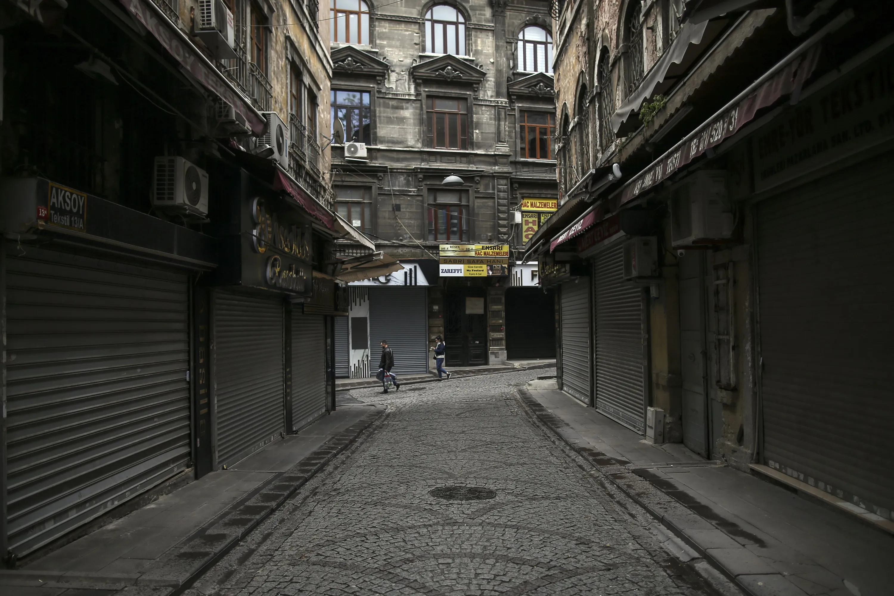 People walk in Eminonu market, an area usually packed with shop goers, but currently nearly deserted due to the strict lockdown to help curb the spread of the coronavirus, in Istanbul, Saturday, May 8, 2021. The “full lockdown”, which began in late April and will last until May 17 came amid a huge surge in infections. (Photo by Emrah Gurel/AP Photo)