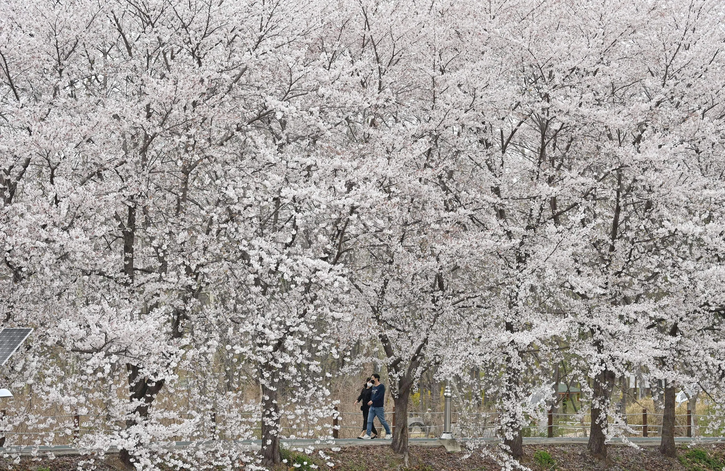 A couple walk under cherry blossoms in full bloom at a park in Seoul on April 2, 2021. (Photo by Jung Yeon-je/AFP Photo)