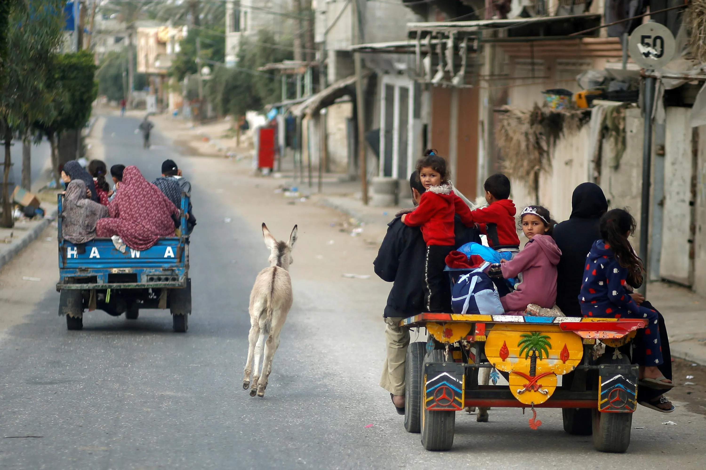 A donkey runs as Palestinians flee their homes during Israeli air and artillery strikes while cross-border violence between the Israeli military and Palestinian militants continues, in the northern Gaza Strip on May 14, 2021. (Photo by Mohammed Salem/Reuters)