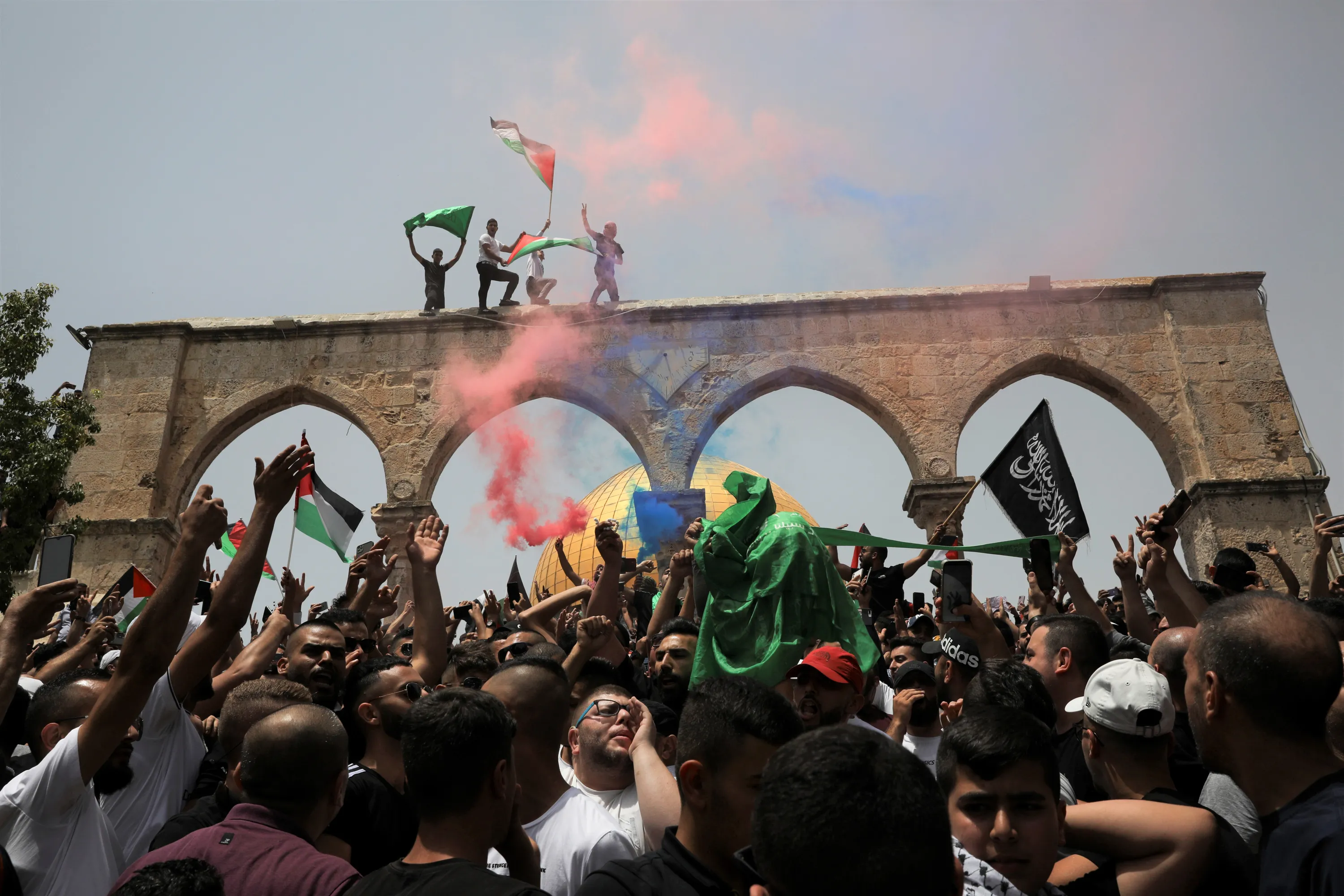 Palestinians wave national flags in front of the Dome of the Rock in the al-Aqsa mosque complex in Jerusalem, Friday, May 21, 202, as a cease-fire took effect between Hamas and Israel after an 11-day war. (Photo by Mahmoud Illean/AP Photo)