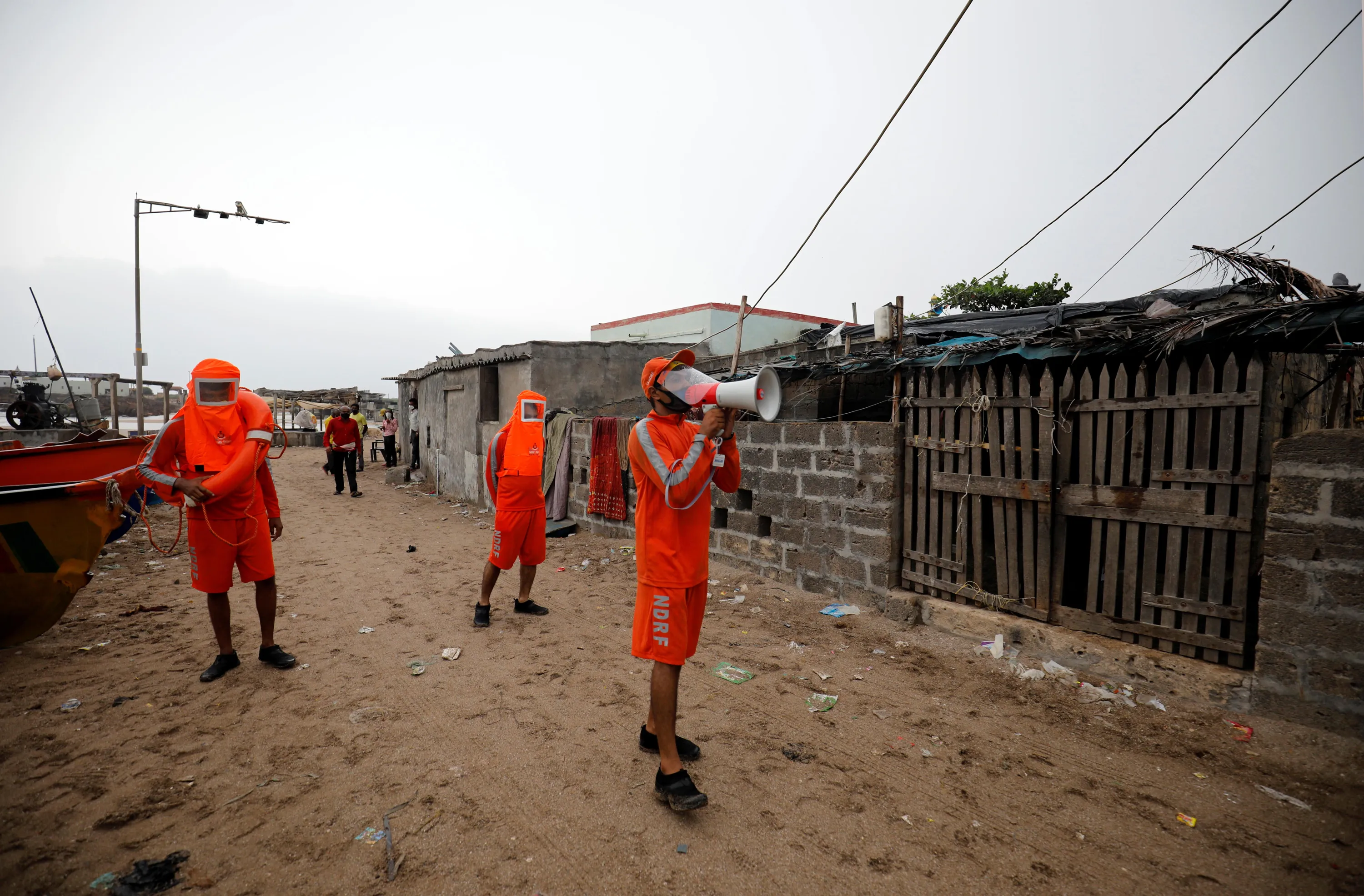 A member of the National Disaster Response Force (NDRF) uses a megaphone to appeal to residents to move to safer place ahead of Cyclone Tauktae in Veraval in the western state of Gujarat, India, May 17, 2021. (Photo by Amit Dave/Reuters)