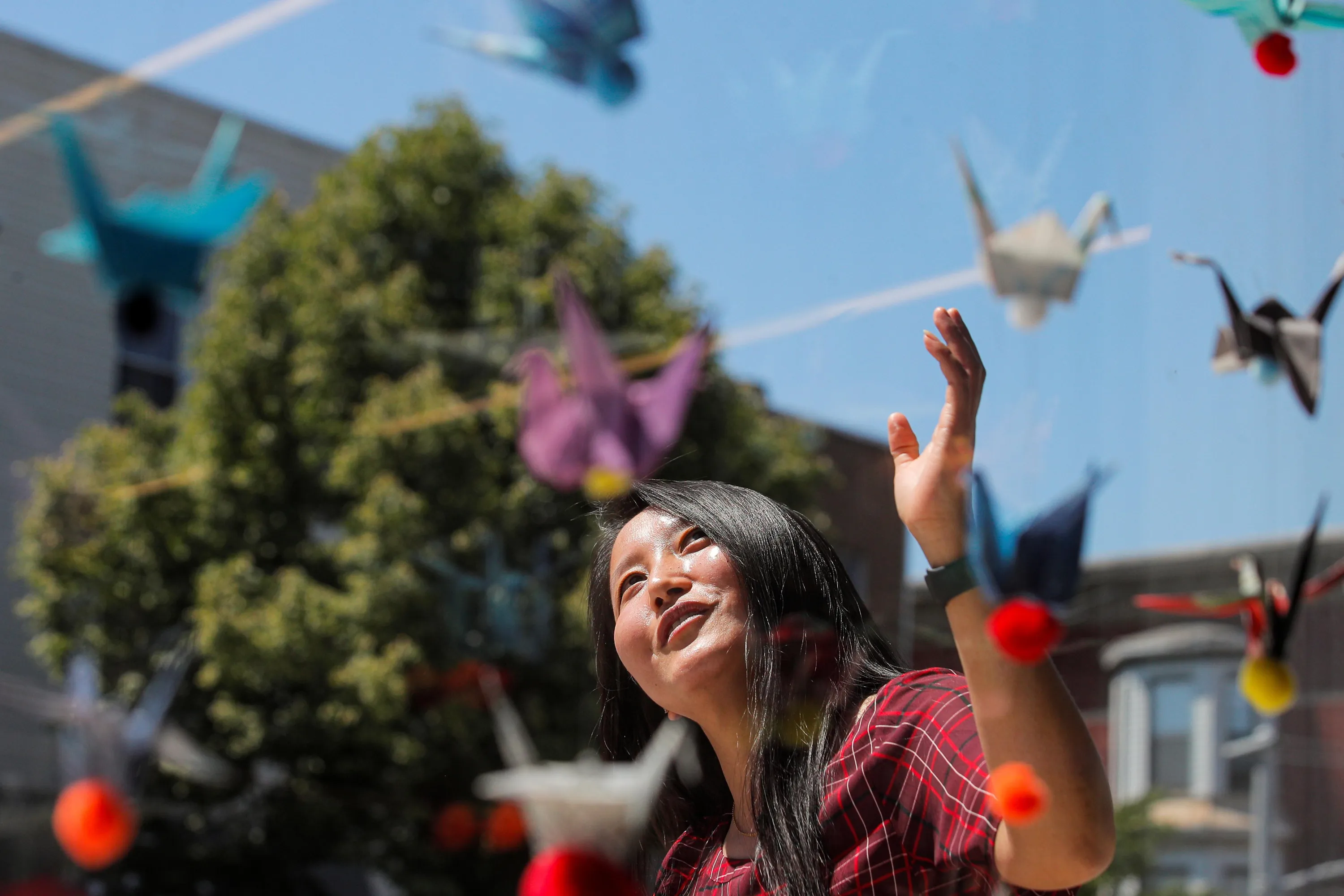Tenzin Kalsang, the Greenpoint children's librarian, looks at some of the 1,000 origami cranes that are displayed to honor victims of the coronavirus disease (COVID-19) pandemic, during an interview at the Greenpoint Library in Brooklyn, New York, U.S., May 17, 2021. (Photo by Brendan McDermid/Reuters)