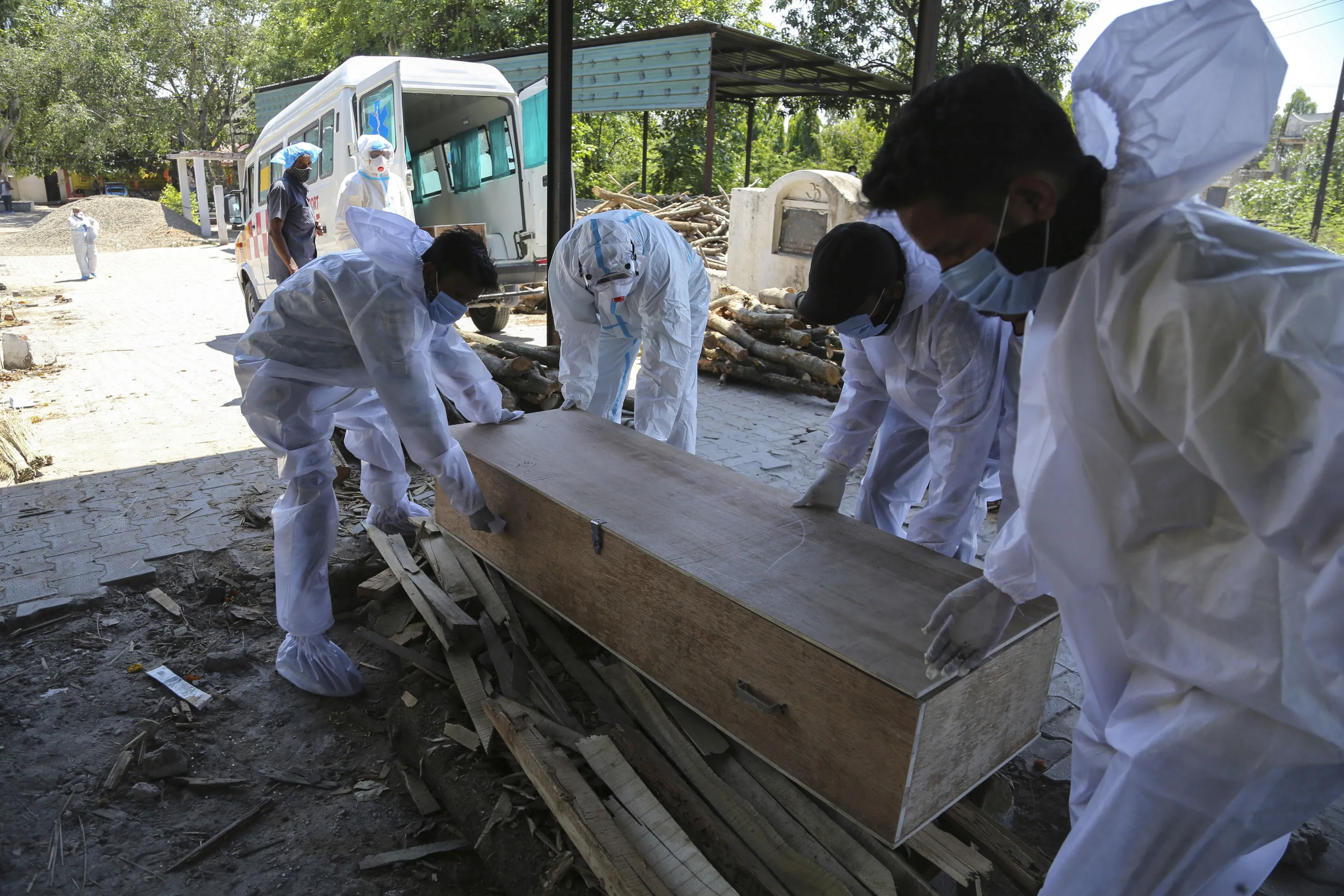 Health workers and relatives carry the body of a COVID-19 victim for cremation in Jammu, India, Monday, May 24, 2021. India crossed another grim milestone Monday of more than 300,000 people lost to the coronavirus as a devastating surge of infections appeared to be easing in big cities but was swamping the poorer countryside. (Photo by Channi Anand/AP Photo)