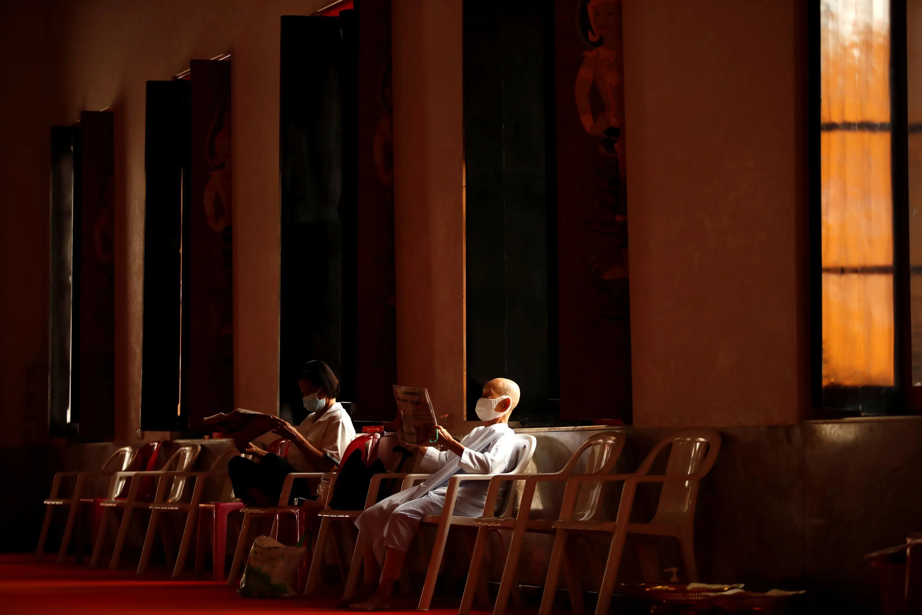 Buddhist nuns wearing face masks read newspapers at Wat Mahathat Yuwaratrangsarit temple as the country struggles with a third wave of infections of the coronavirus disease (COVID-19) outbreak in Bangkok Thailand on April 26, 2021. (Photo by Jorge Silva/Reuters)