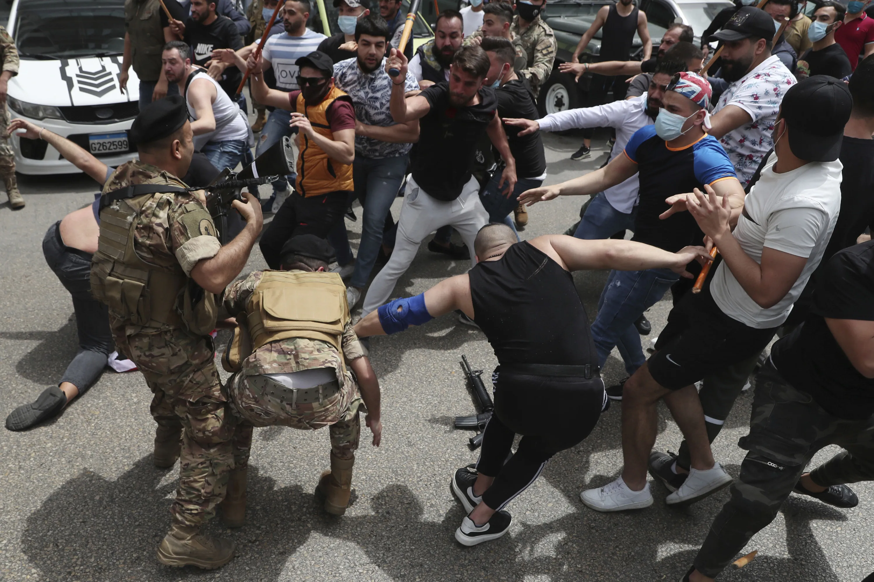 In this April 19, 2021 file photo, opponents of Judge Ghada Aoun try to strip an army soldier of his rifle as scuffles break out during a sit-in outside the Justice Palace, in Beirut, Lebanon. (Photo by Bilal Hussein/AP Photo/File)