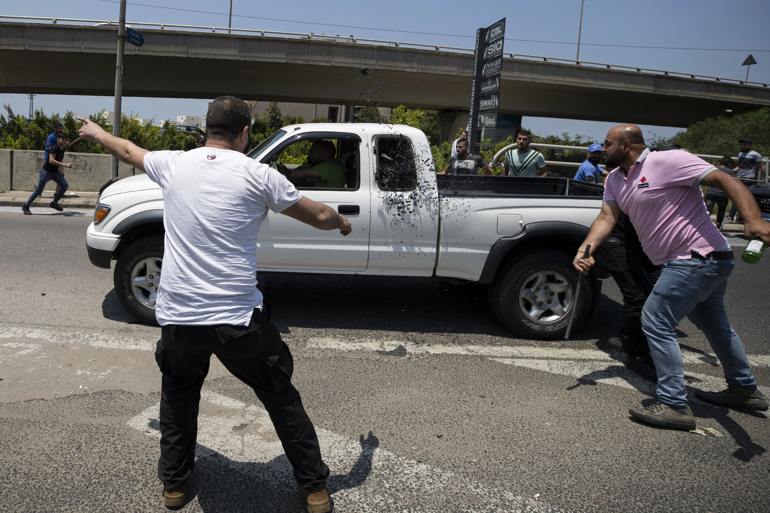Syrians attack a Lebanese man who drove his truck into a crowd and running over one of the them, during clashes between Syrian voters and members of the Christian rightwing Lebanese Forces group that were traveling to the embassy to vote in the town of Zouk Mosbeh, north of Beirut, Lebanon, Thursday, May 20, 2021. Mobs of angry Lebanese men attacked vehicles carrying Syrians expatriates and those who fled the war heading to the Syrian embassy in Beirut on Thursday, protesting against what they said was an organized vote for President Bashar Assad. (Photo by Hassan Ammar/AP Photo)