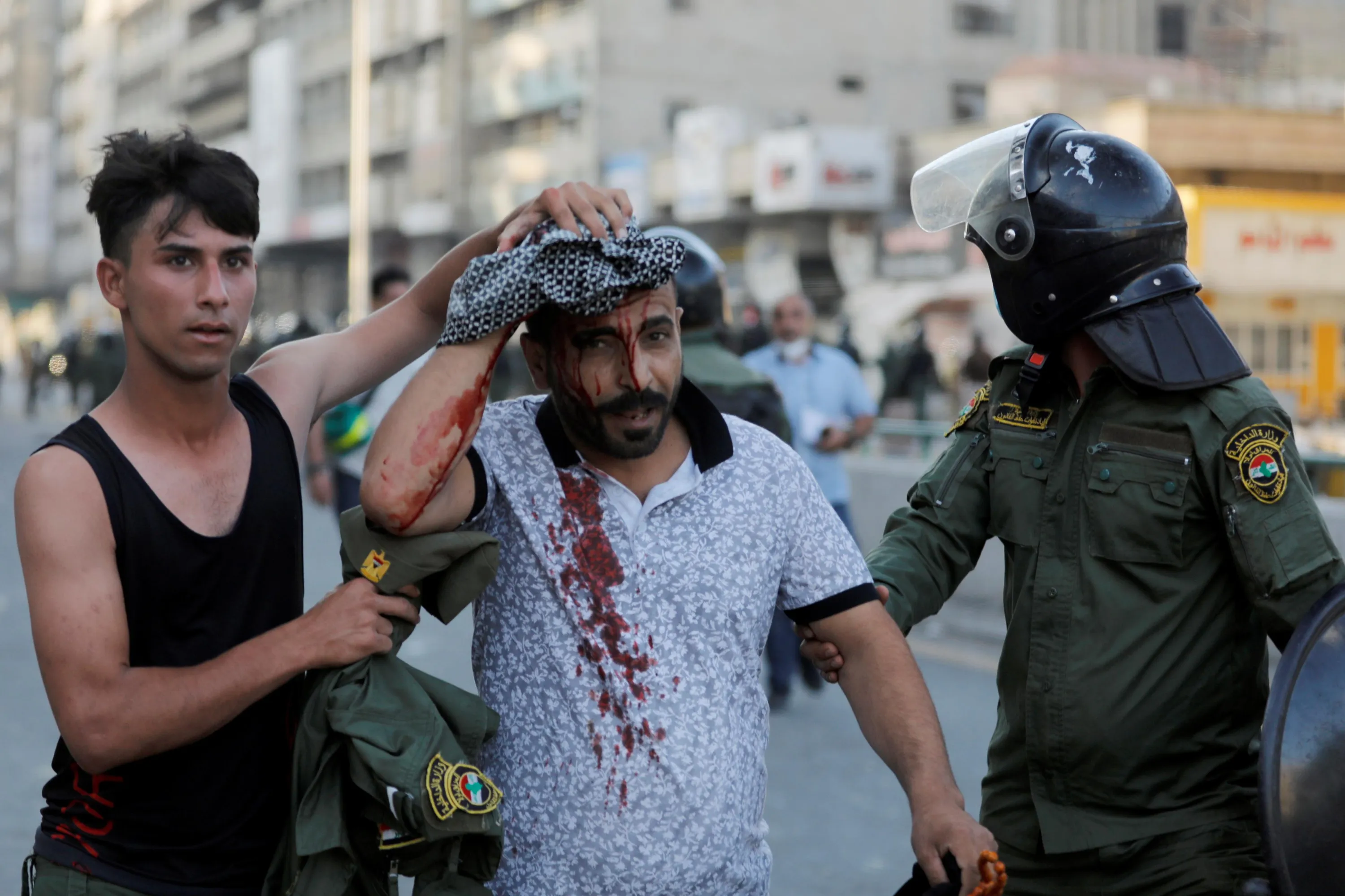 Members of Iraqi security forces escort an injured demonstrator during an anti-government protest in Baghdad, Iraq on May 25, 2021. (Photo by Khalid al-Mousily/Reuters)
