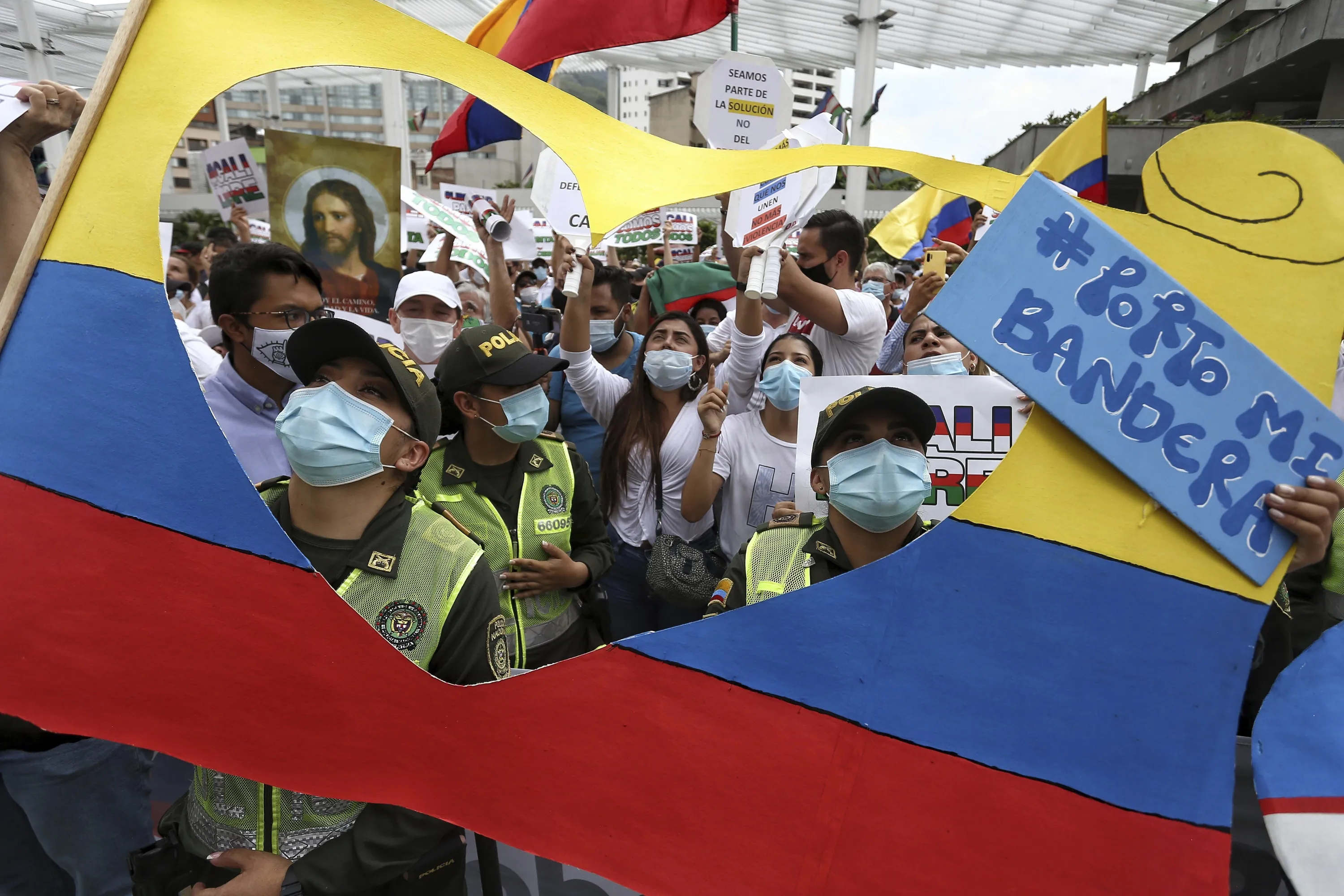 Police and civilians attend a silent march to support the unblocking of the city's main entrance and exit roads that have been blocked by anti-government protests in Cali, Colombia, Tuesday, May 25, 2021. Colombians have taken to the streets for weeks across the country after the government proposed tax increases on public services, fuel, wages, and pensions. (Photo by Andres Gonzalez/AP Photo)