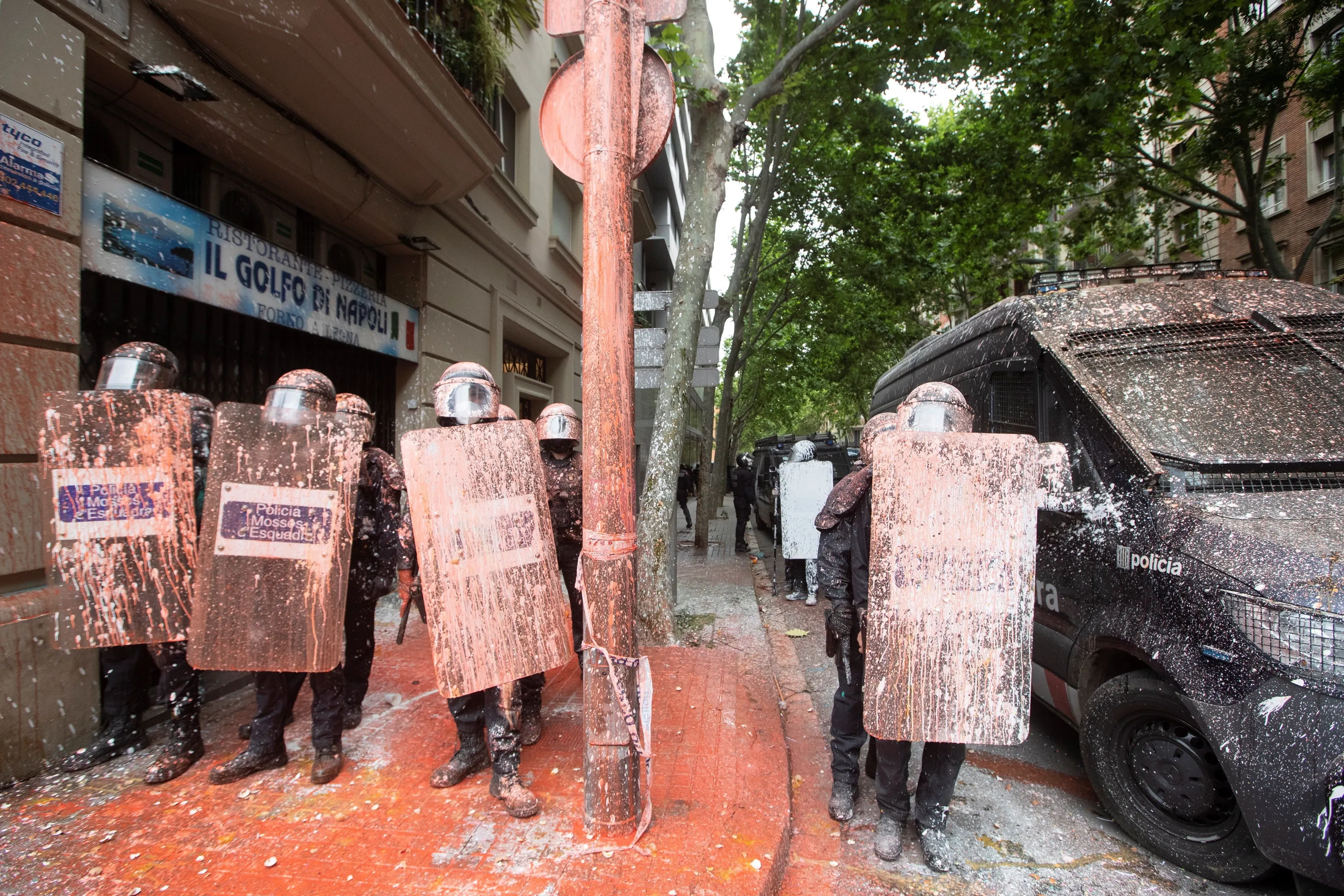 Riot police on guard as people throw paint and objects against them as they protest against the eviction of an occupied dwelling at a building called Bloc Llavors in Poble Sec neighborhood in Barcelona, Spain, 25 May 2021. (Photo by Marta Perez/EPA/EFE)